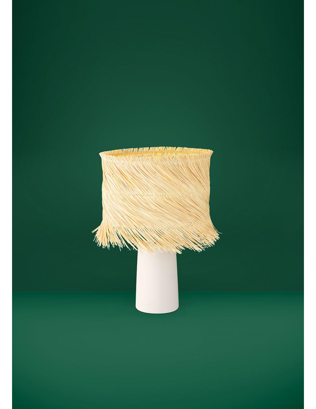 Lámpara de mesa con una pantalla fabricada en ratán trenzado de color natural. El trenzado está abierto en el borde inferior y superior. La pantalla está instalada sobre una base de cerámica beige. Este modelo se puede combinar fácilmente con muebles de estilo natural y bohemio y ofrece una iluminación acogedora para cada estancia, ya sea en el salón o el dormitorio. La bombilla no está incluida. La lámpara es apta para cualquier bombilla con casquillo E27.