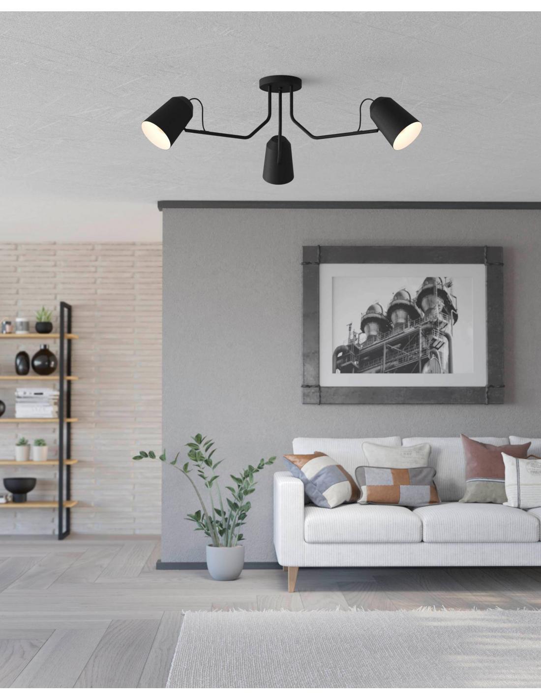 La lámpara de techo LORETO está hecha de metal negro con tres brazos de luz curvos y cabezales de luz móviles. El interior blanco mate de los cabezales garantiza una buena iluminación y los elementos de iluminación móviles le ofrecen la oportunidad de establecer puntos de iluminación personalizados en la estancia. La lámpara de techo de diseño minimalista, se integra a la perfección en mobiliarios modernos de estilo escandinavo y proporciona una iluminación adecuada en sus ambientes. Las bombillas no están incluidas. La lámpara es apta para cualquier bombilla con casquillo E27.