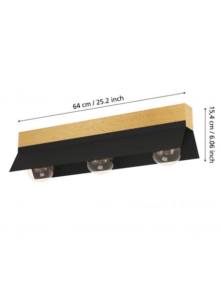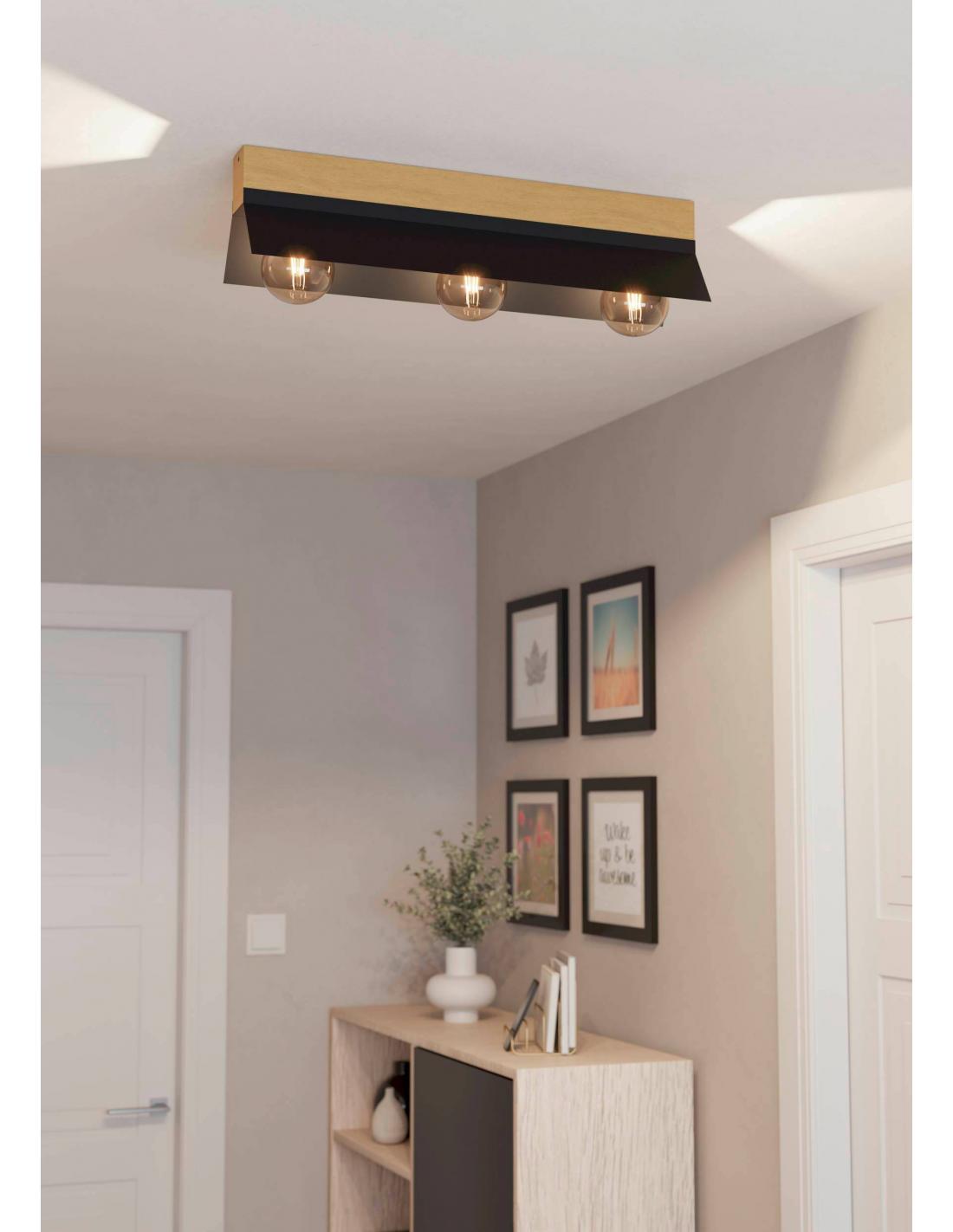 Lampara de techo de 3 luces original diseñada con barra de madera como base y decorativas piezas de metal en color negro que distribuyen la luz en un abanico más estrecho para que la luz no pierda intensidad. Es una pieza distinta y con mucho que aportar en una entrada, comedor e incluso dormitorio. Gracias a sus casquillos situados estratégicamente, recomendamos el uso de 3 bombillas vintage para que la lámpara luzca en su mejor expresión. Bombillas no incluidas.
