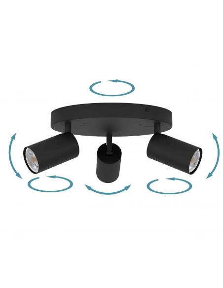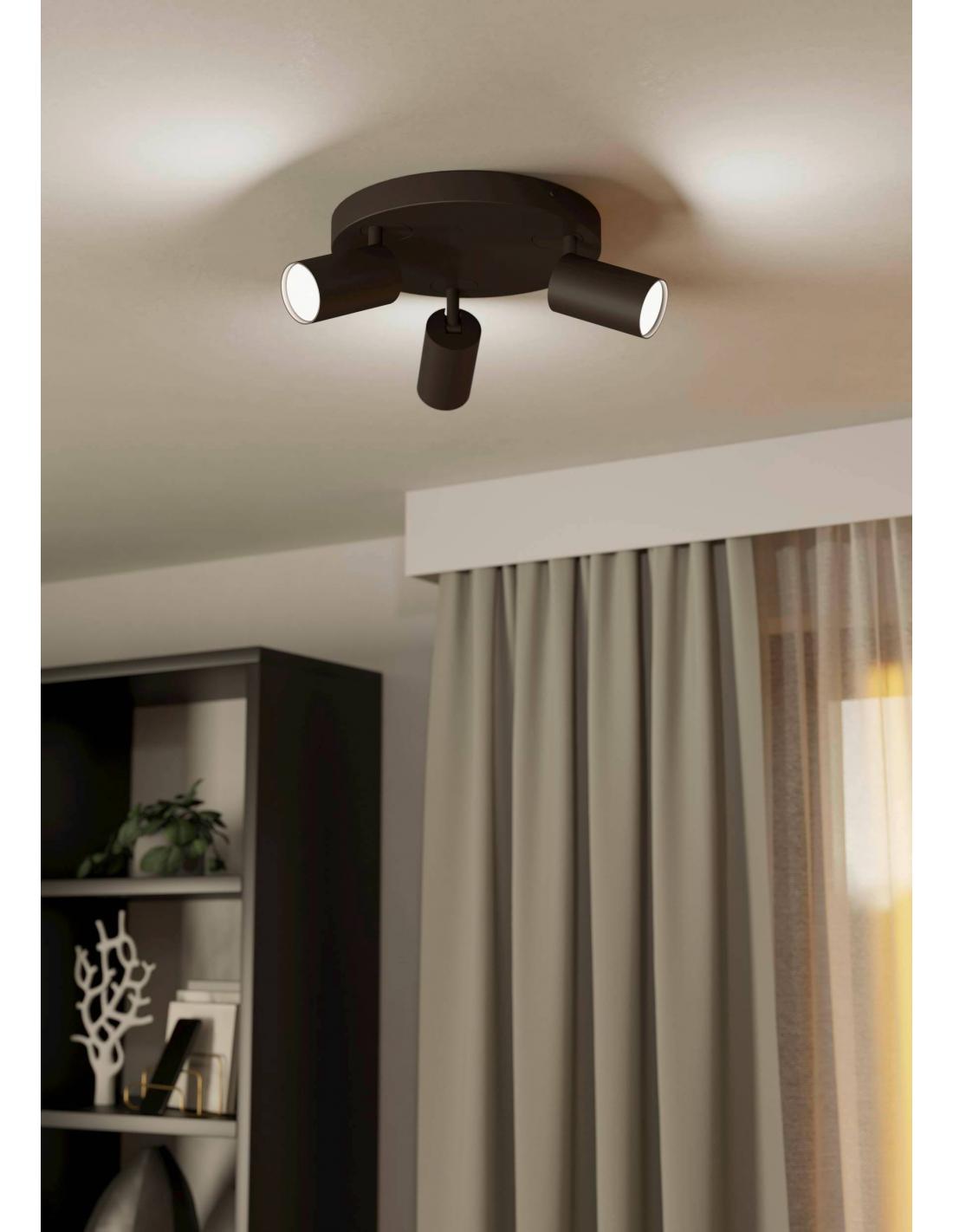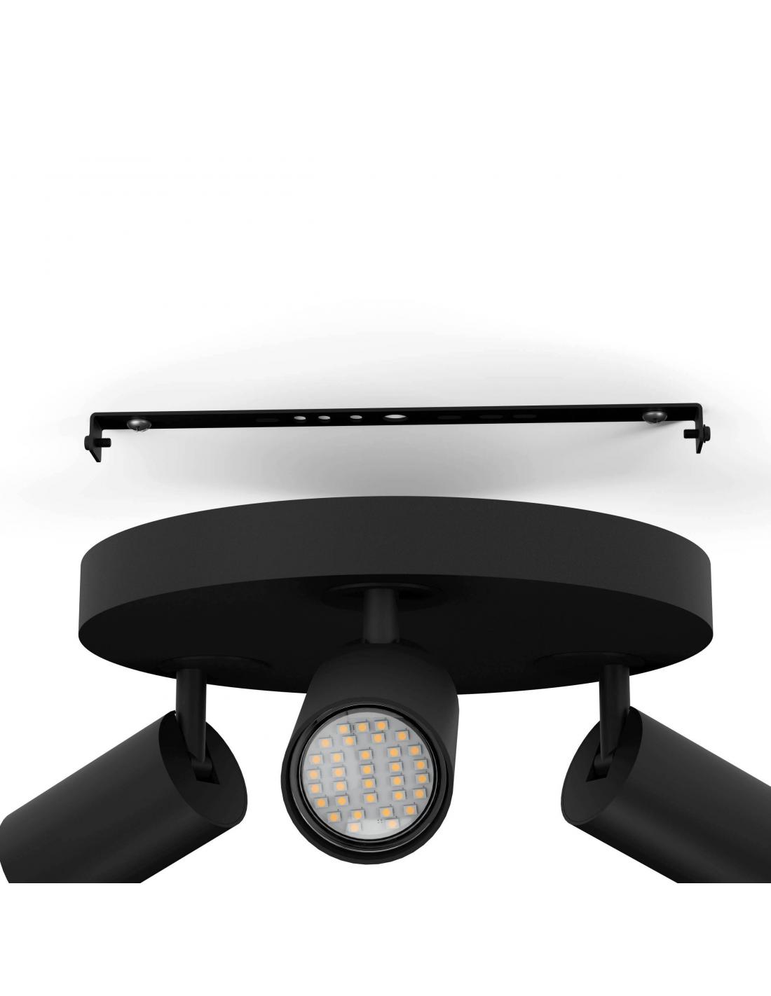 Foco de techo de tres luces fabricado en acero de color negro con todos sus focos dirigibles para un óptimo uso de la luminaria. Esta lámpara sencilla y funcional viene con bombillas GU10 incluidas y además cuenta con funciones inteligentes: control remoto de la misma, vía app gratuita o mando (no incluido) control de la temperatura y color de su lus y muchas otras funciones que no puedes perderte. ¡Te encantará!