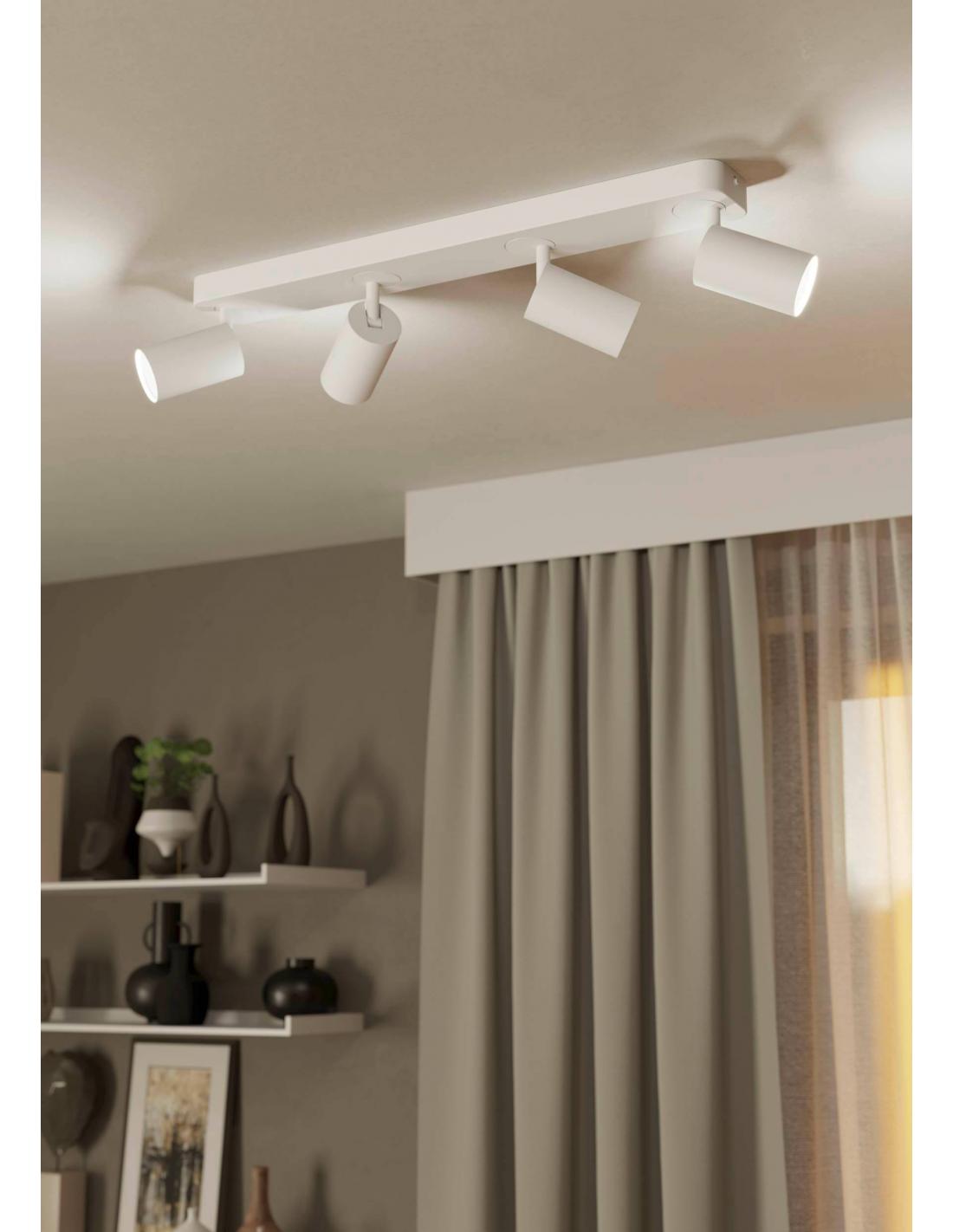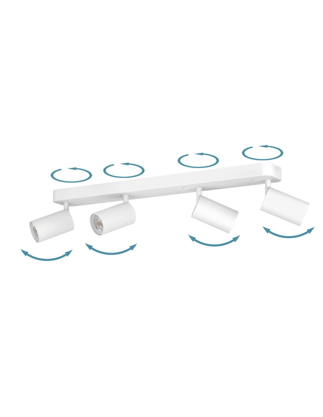 Foco de 4 luces GU10 en acero blanco con función inteligente CONNECT Z con la que podrás controlar cómodamente su funcionamiento vía app o con mando (no incluido), controlar la temperatura de su luz dependiendo el ambiente que necesites (más cálido para momentos de relax, más blancos para momentos de trabajo), cambio del color de luz y muchas más funciones disponibles en la aplicación. Focos orientables y bombillas INCLUIDAS.