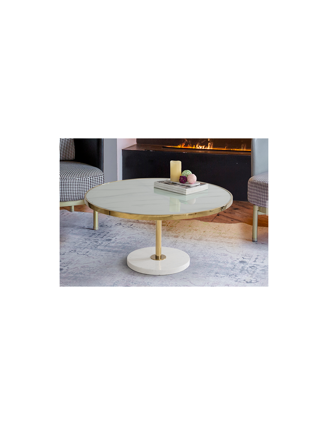 Mesa de centro realizada en acero inoxidable acabado dorado. Base de mármol blanco y tapa de cristal templado acabado imitación mármol blanco.