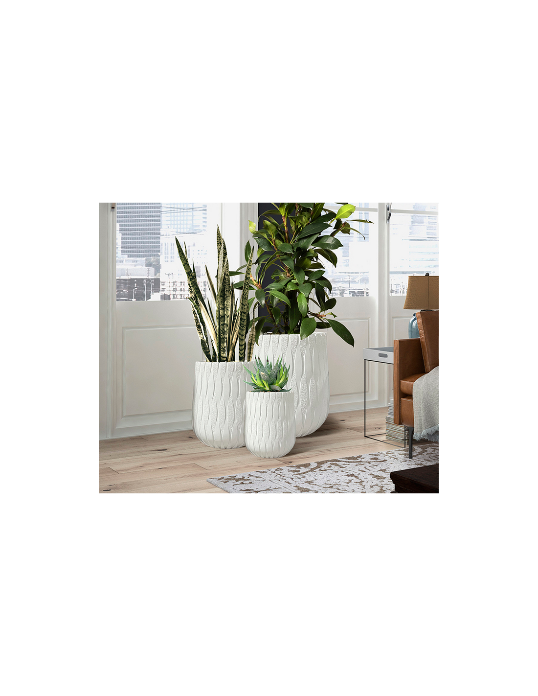 Set de tres maceteros realizados en fibra de vidrio y resina Fiberclay, acabado en blanco. Uso interior y exterior. Gde. Ø51x60cm. Med. Ø40x48cm. Peq.Ø29x36cm.