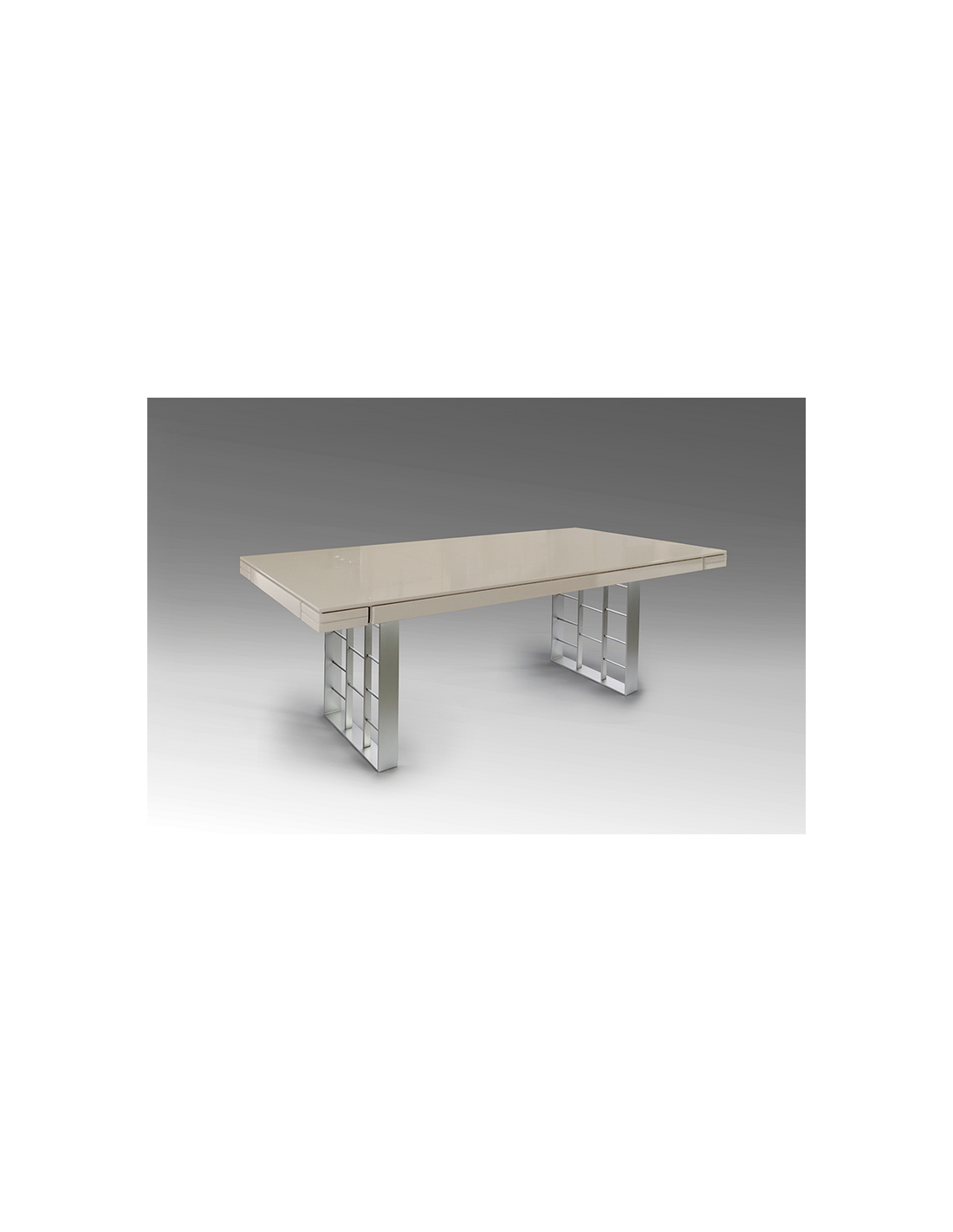 Mesa de comedor realizada en DM acabado gris ceniza, lacado brillo,con ranuras decorativas y placas en cromo. Patas metálicas con acabado pintura plata mate.