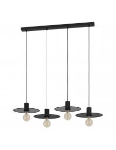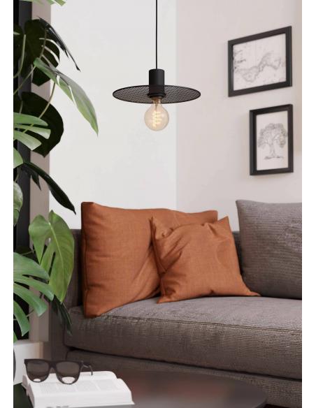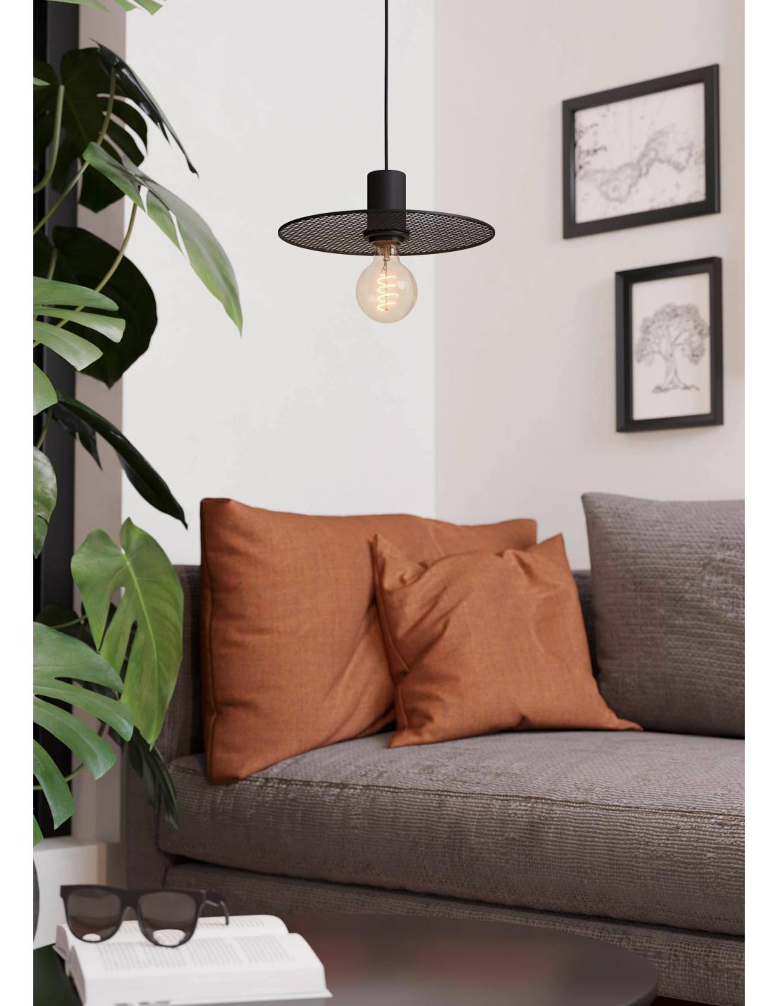 La lámpara colgante IKESTON está fabricada con un cabezal de luz formado por un portalámparas de metal negro con un elemento redondo de metal. La pantalla está suspendida de un dosel de metal del mismo color mediante un cable textil negro. La lámpara se combina con una bombilla visible. La lámpara colgante con su estilo industrial encaja en cualquier estilo y proporciona una iluminación especial en cualquier estancia, ya sea el salón o el comedor. La bombilla de filamentos que se muestra no está incluida. La lámpara es apta para cualquier bombilla con casquillo E27.