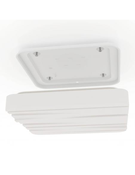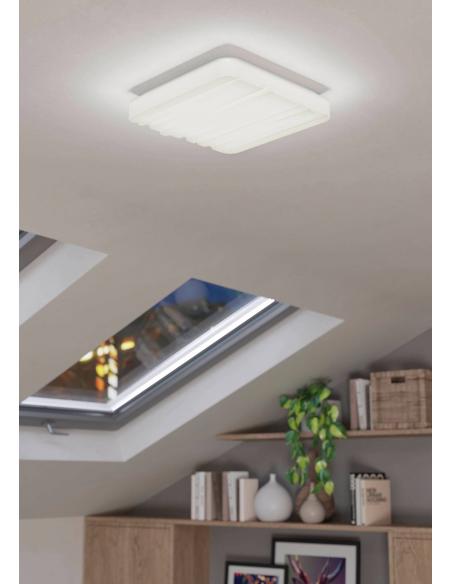 Plafón LED de 28 cm cuadrado con base de acero color blanco y pantalla acrílica blanca. Al ser LED repartirá la luz por toda su pantalla creando un efecto uniforme y elegante, que acompañado de su acabado decorativo en forma de surcos creará un ambiente moderno y distinto de un plafón más básico. Ideal para cocinas pequeñas, zonas de paso o baños.