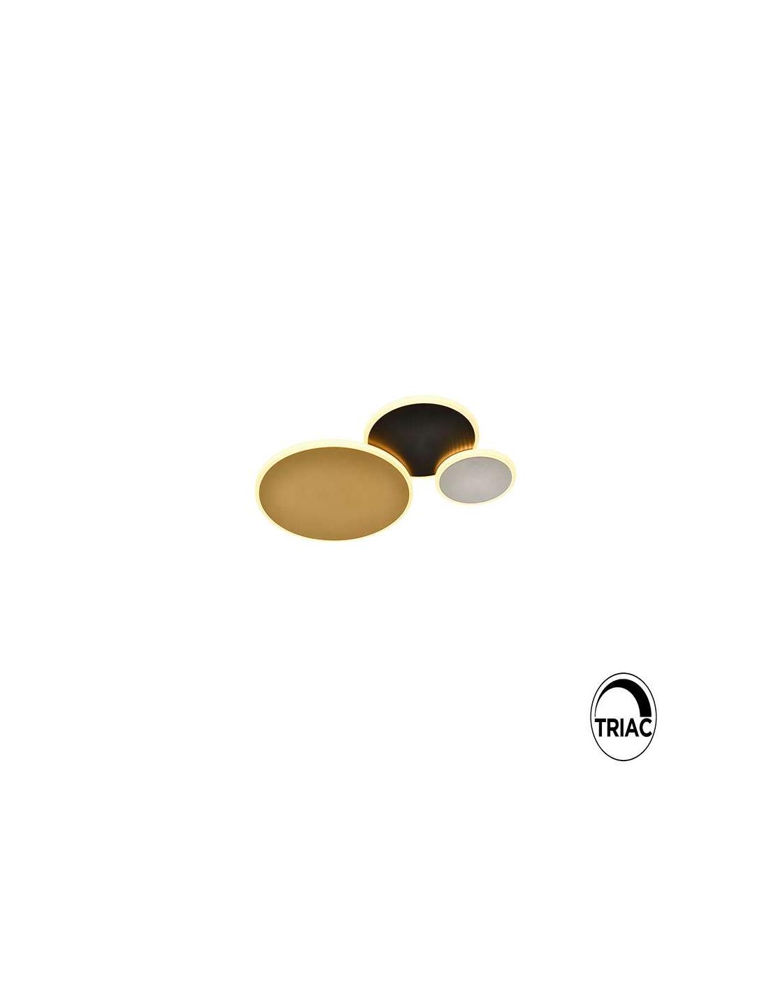 Plafón de techo, realizado en metal y aluminio, acabado en dorado, blanco y negro mate. Difusor de acrílico opal. 32W, 1.900lm, 3.000K. DIMABLE.