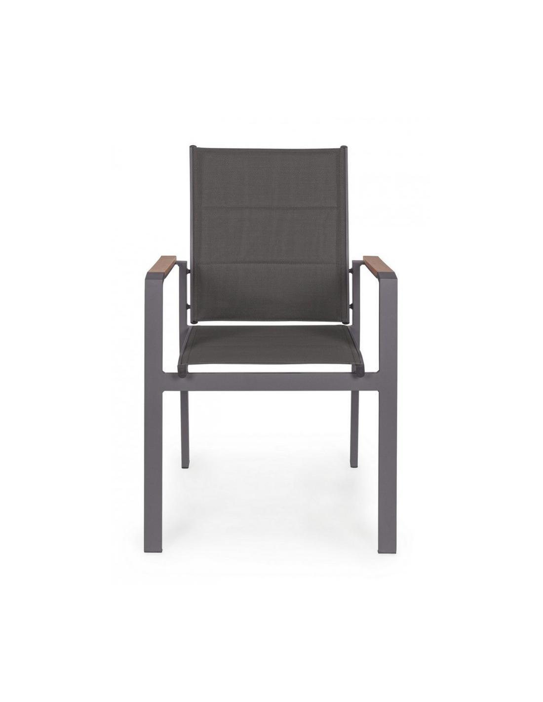 Estructura de aluminio, con revestimiento en polvo (poliéster). Brazos con aplicaciones de polywood. Revestimiento asiento y respaldo de textilene 2x2 (con mullido). Apilable. Embalaje sin cartón.