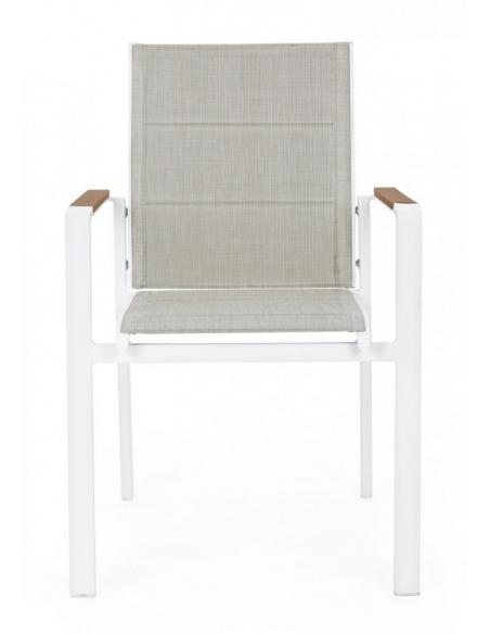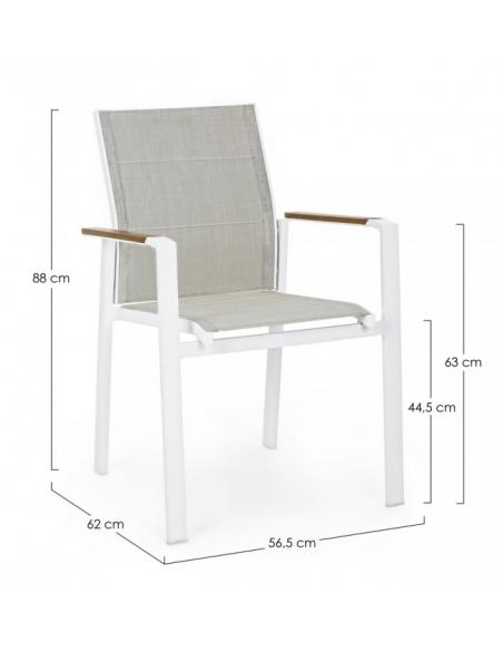 Estructura de aluminio, barnizado con polvo (poliéster). Reposabrazos con inserciones de polywood. Revestimiento asiento y respaldo de téxtilene 2x1 (relleno). Apilable. Embalaje sin cartón.