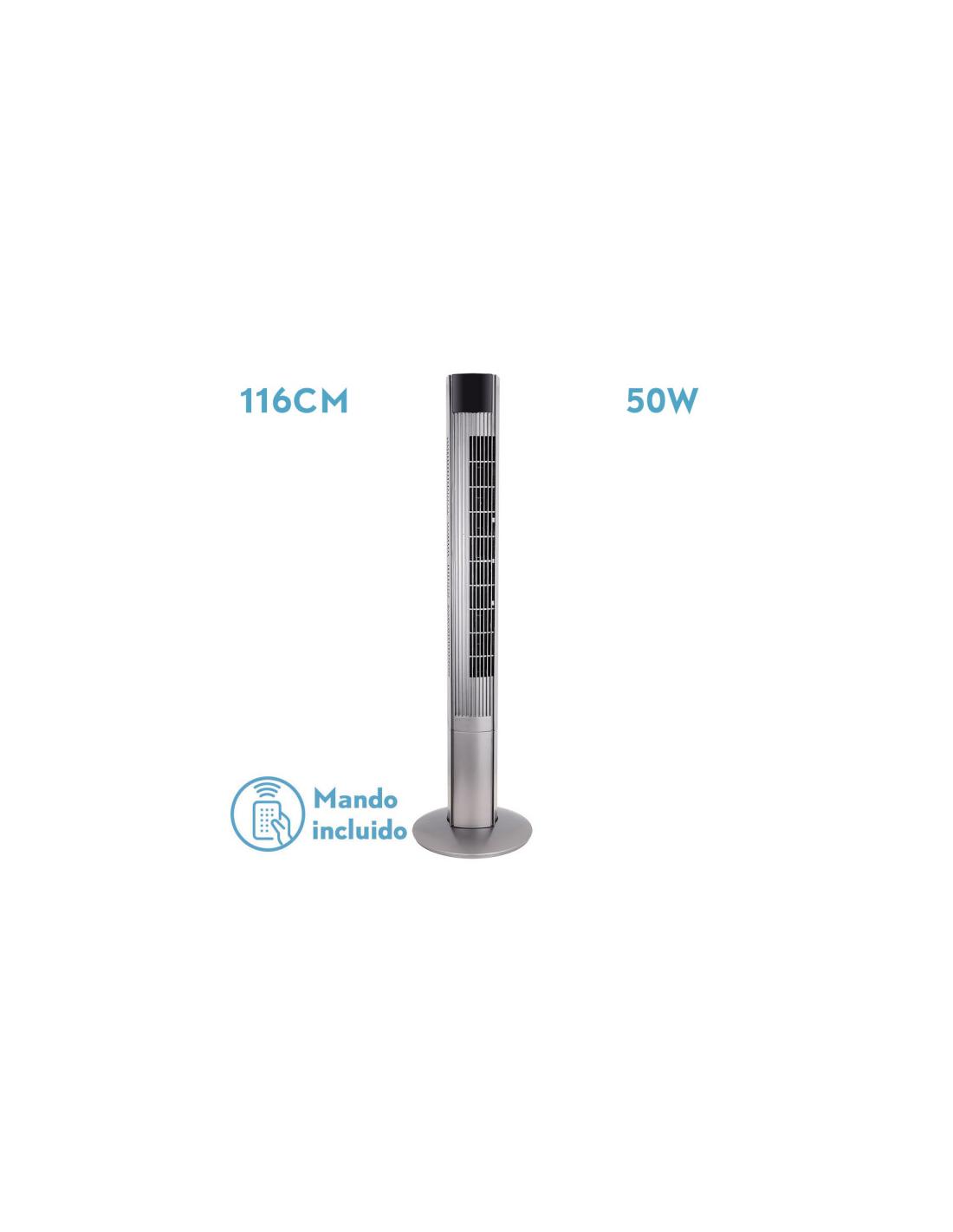 Ventilador de Torre de la serie PRINCIPE en color PLATA. Realizado en metal y ABS. Con 50 watios de potencia, tres velocidades y tres modos de aire (natural-sueño-normal), con dos posiciones, fijo y rotatorio, que podrá seleccionar para obtener el modo y distribución de aire deseada según las necesidades de la habitación a ventilar. Diseño muy moderno y actual para formar parte de su decoración y de fácil manejo. Tiene una medida de 116 centímetros de alto y una base de 32 centímetros de diámetro. Mando a Distancia INCLUÍDO y TEMPORIZADOR hasta 7,5 horas para su comodidad y un mayor ahorro de energía.