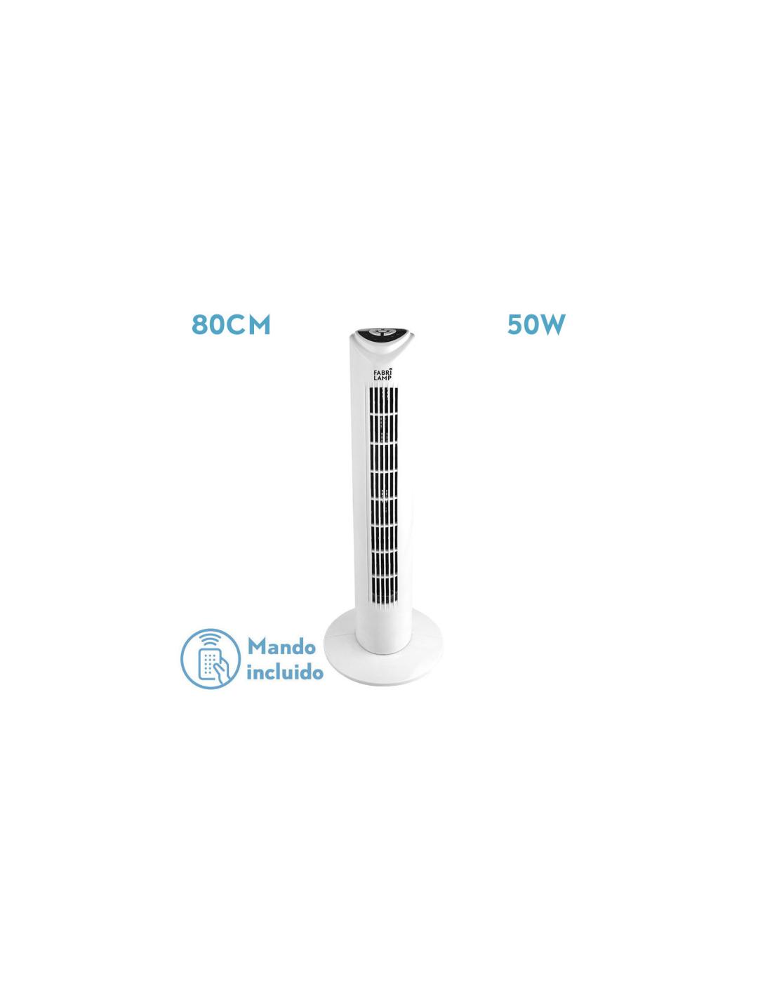 Ventilador de Torre TUKA en color BLANCO. Realizado en metal y policarbonato. Con 50 watios de potencia, tres velocidades y dos posiciones, fijo y rotatorio. Tiene una medida de 80 centímetros de alto y una base de 25 centímetros de diámetro. Mando a Distancia INCLUÍDO y TEMPORIZADOR hasta 7,5 horas.