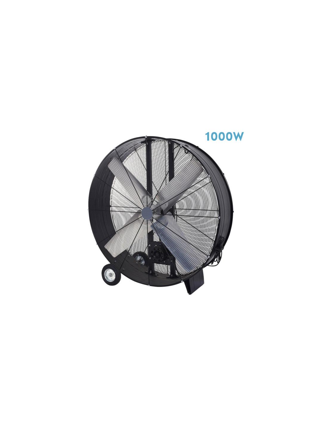 Gran Ventilador industrial de la serie MAXIMUM realizado en metal y aluminio de color NEGRO con cuatro fuertes aspas aerodinámicas de aluminio y dos velocidades. Tiene una potencia de 1000 watios y una medida de 115x112x36 centímetros. Equipado con útiles ruedas en su estructura y un asa lo que facilita el traslado de una zona a otra. Disponible en esta serie de 360 watios y de 1000 watios con sus tamaños correspondientes.<br/>