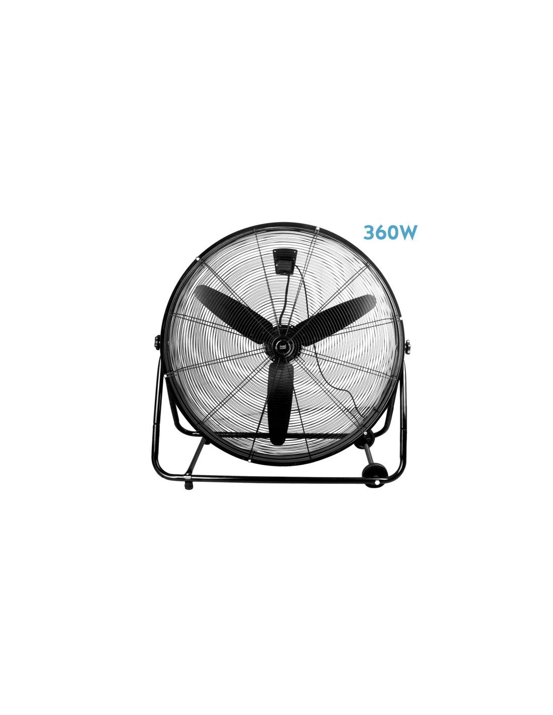 Ventilador industrial VENDAVAL realizado en metal de color NEGRO con tres fuertes aspas aerodinámicas de aluminio y tres velocidades. Tiene una potencia de 360 watios y una medida de 92,5x95x42 centímetros. Equipado con útiles ruedas en su estructura lo que facilita el traslado de una zona a otra.