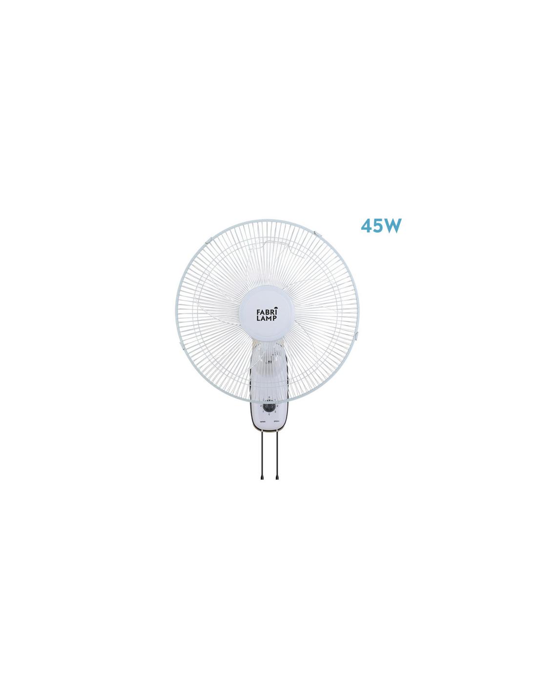 Ventilador de pared de la serie CUDO realizado en metal y policarbonato, de color BLANCO con cinco aspas TRANSPARENTES y tres velocidades. Motor AC. Con dos posiciones de cabezal, fijo y rotatorio, también oscilante, pudiendo redirigir el aire a la zona que desee. Con útil sistema de cadenas para cambiar de velocidad y ritmo de funcionamiento. Tiene un consumo de 45 watios y una medida de 53X43X30 centímetros.