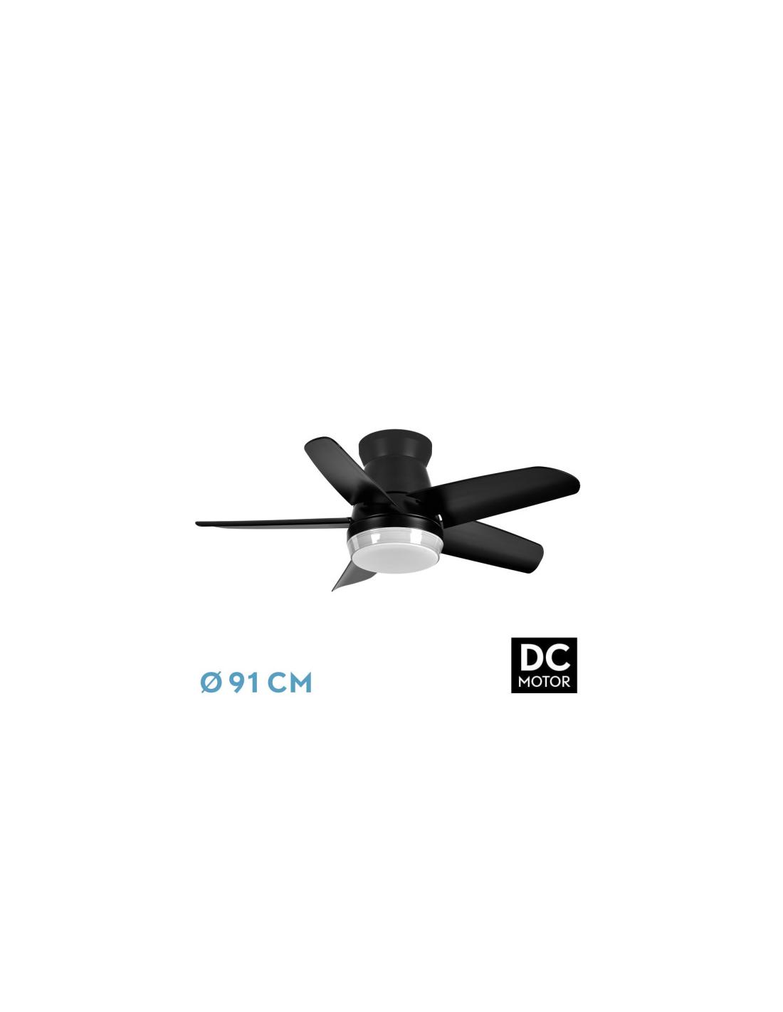 Ventilador de la serie NEUTRON realizado en metal, ABS y policarbonato, en color NEGRO con cinco aspas. Motor DC, seis velocidades. Tecnología LED incorporada con una potencia de 24W, 2400 lúmenes y 3 TEMPERATURAS SELECCIONABLES DE LUZ (3000-4500-6000K) luz cálida, natural y blanco frío. De diseño muy moderno y original, ideal para colocar en dormitorios, salas de estar y estudios inspirados en los nuevos estilos de decoración como el Industrial ó moderno. Tiene unas dimensiones de 32,5X91X91 centímetros. Control de aire verano o invierno. Mando a distancia INCLUIDO con MEMORIA DE COLOR incorporada y TEMPORIZADOR 1/2/4/8 H. Modelo disponible en color negro, blanco, cuero/negro, blanco/haya y plata.