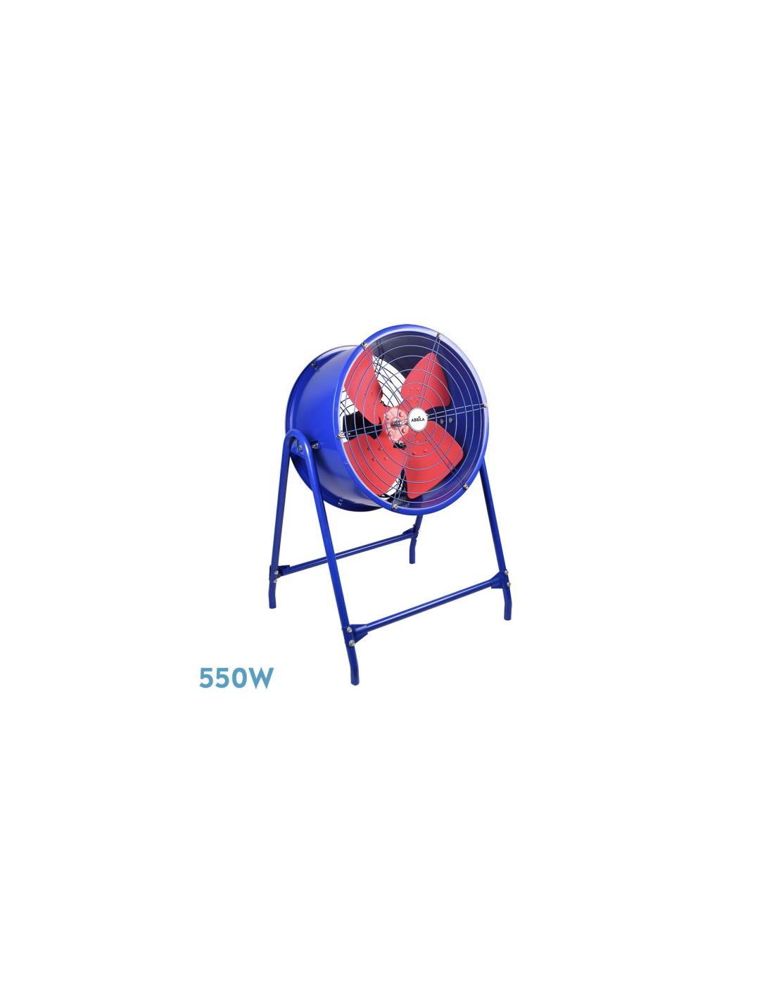 Ventilador industrial de la serie DANA realizado en metal de color AZUL/ROJO con cuatro fuertes aspas aerodinámicas y con una sola velocidad. Tiene una potencia de 550 watios, se presenta sobre un soporte de cuatro patas y una medida de 103x58x32 centímetros.