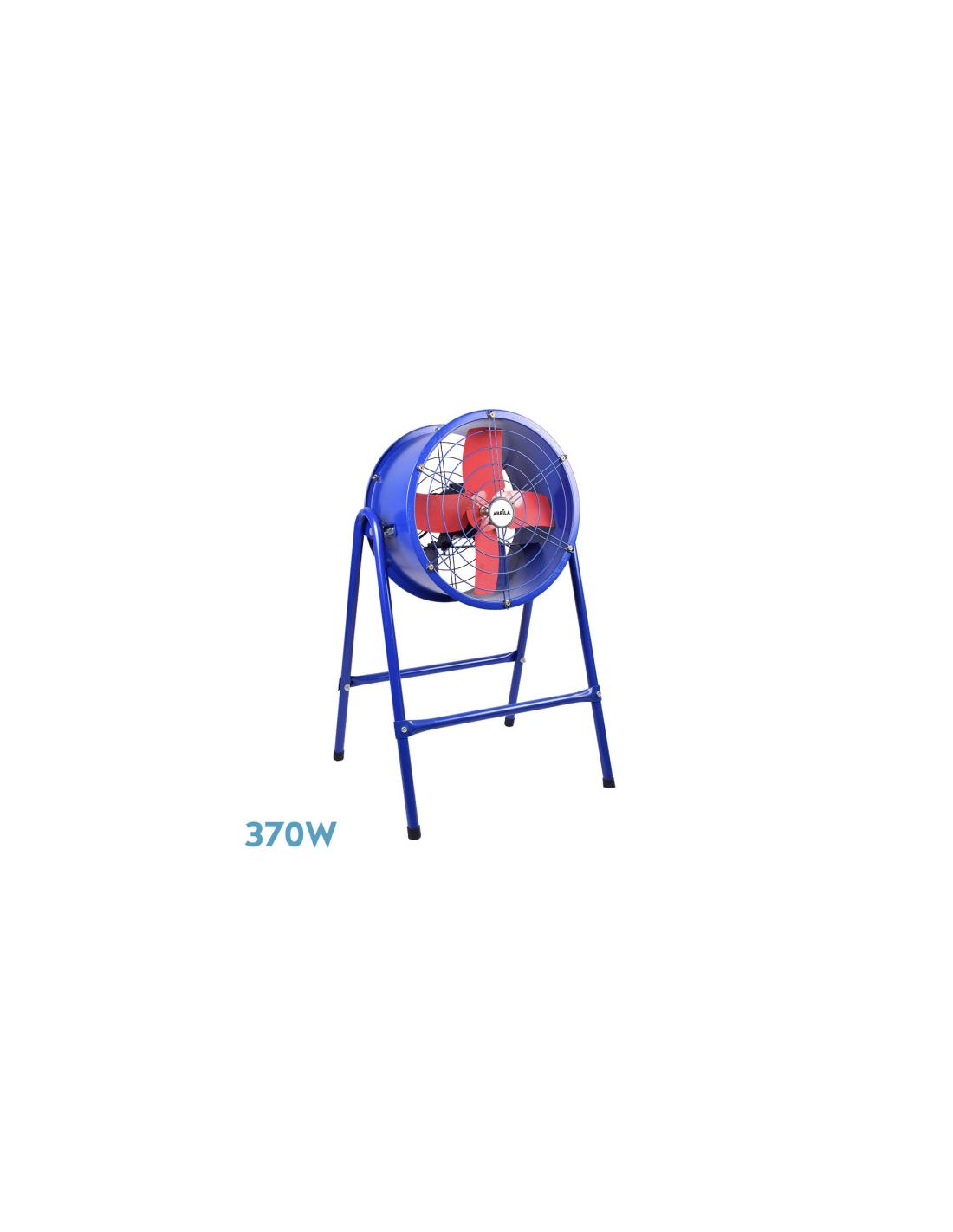 Ventilador industrial de la serie TORRENTE realizado en metal de color AZUL/ROJO con cuatro fuertes aspas aerodinámicas y con una sola velocidad. Tiene una potencia de 370 vatios, se presenta sobre un soporte de cuatro patas y una medida de 98x48x27 centímetros.
