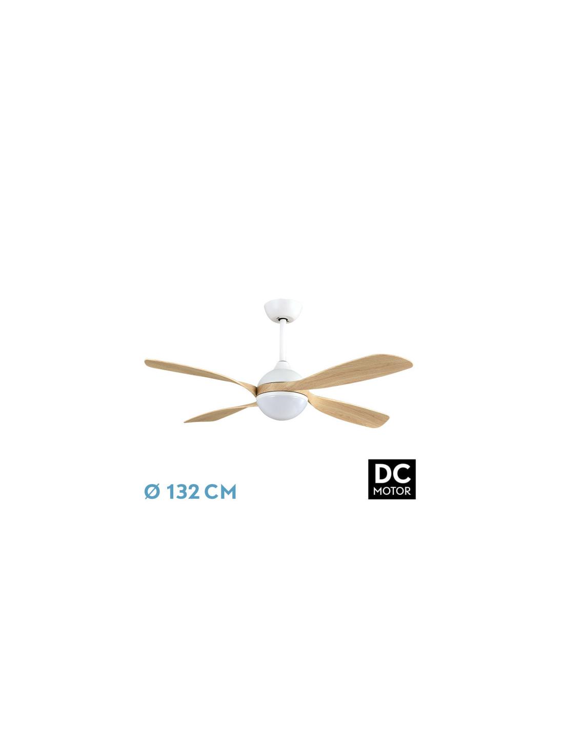 Ventilador DC de la serie LIVORNO realizado en metal, MDF y policarbonato, en color BLANCO con cuatro aspas de color HAYA. Tiene seis velocidades ajustables con motor DC. Tecnología LED incorporada con una potencia de 30W, con 3 TEMPERATURAS SELECCIONABLES DE LUZ( 3000-4500-6000K) y 3250 lúmenes. Su diseño moderno pero a la par que elegante, con aspas aerodinámicas de gran tamaño, lo hacen ideal para salones, comedores, espacios abiertos y zonas de trabajo. Tiene unas dimensiones de 39,2/51,7x132x132 centímetros, incluye dos medidas de TIJA (12,5 cm y 25 cm), lo que permite adaptarlo a distintas alturas. Control de aire verano o invierno. Mando a distancia INCLUIDO, MEMORIA DE COLOR incorporada y TEMPORIZADOR 1/2/4/8 H. Modelo disponible en color blanco, negro, blanco/haya y negro/roble.