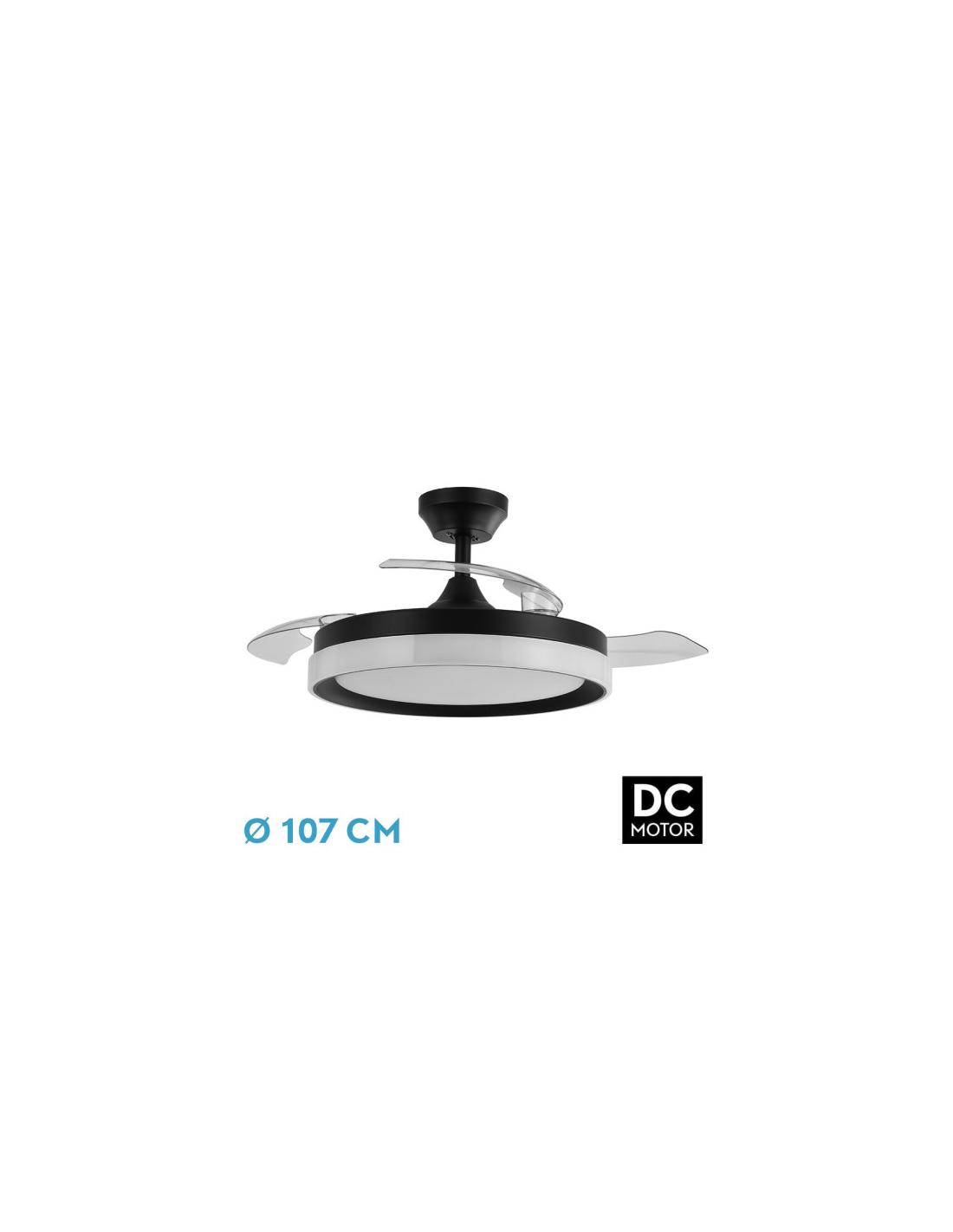 Ventilador DC de la serie ZENIT en color NEGRO con tres aspas DESPLEGABLES muy resistentes. Realizado en metal, ABS y policarbonato, de diseño moderno, muy original y elegante. Tiene seis velocidades ajustables. Motor DC. Tecnología LED integrada con una potencia de 72W, 7200 lúmenes y 3 TEMPERATURAS SELECCIONABLES DE LUZ (3000-4500-6000K), luz cálida, luz natural y blanco frío. Control de aire verano o invierno. Su medida es de 36,5/49X49 centímetros con las aspas plegadas y de 36,5/49X107 centímetros con las aspas desplegadas, viene con DOS MEDIDAS DE TIJA para colocar a distintas alturas de techo. Mando a distancia INCLUIDO con MEMORIA DE COLOR y TEMPORIZADOR 1/2/4/8 H. Modelo disponible en color cuero, blanco, negro y níquel.