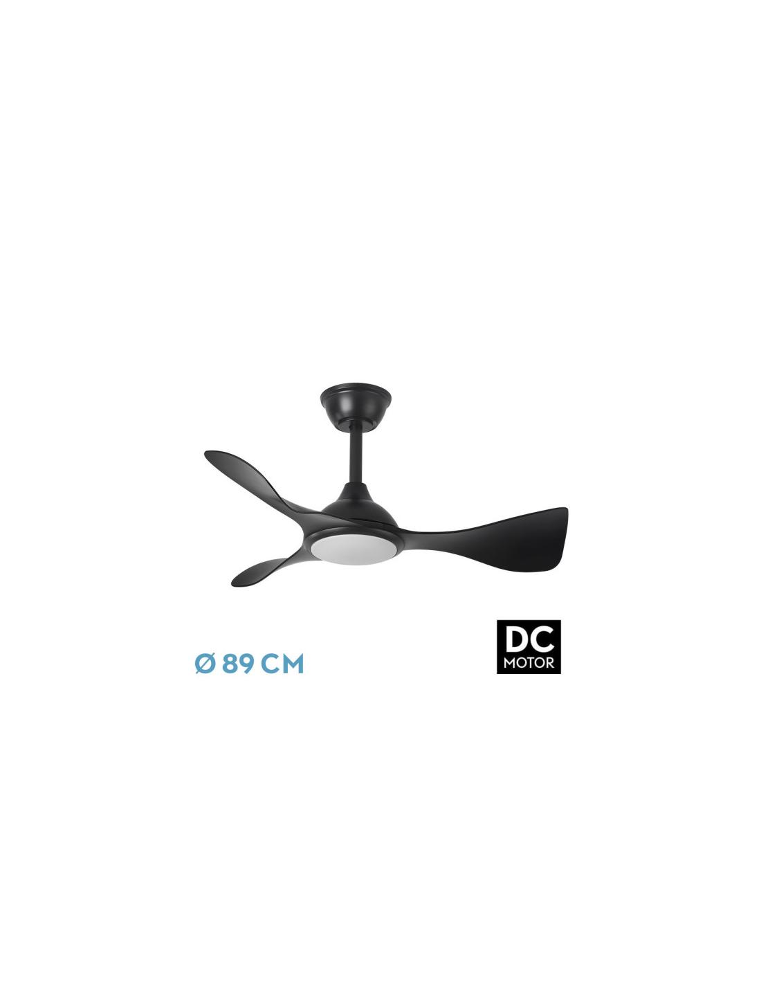 Ventilador DC de la serie CAIMAN realizado en metal, ABS y policarbonato, en color NEGRO con tres aspas. Tiene seis velocidades ajustables. Motor DC, con INSTALACION DE LUZ OPCIONAL. Tecnología LED incorporada con una potencia de 36 vatios, con 3 TEMPERATURAS DE LUZ( 3000-4500-6500K) y 3600 lúmenes. De diseño moderno y original. Su medida es de 26/41X89X89 centímetros, con dos tijas de 10 y 25 centímetros para instalar a distintas alturas. Control de aire verano e invierno. REGULABLE EN INTENSIDAD, con mando a distancia INCLUIDO, MEMORIA DE COLOR incorporada y TEMPORIZADOR 1/4/8 H. Su voltaje va de 186 a 265 vatios, lo que resiste en un campo muy amplio a subidas y bajadas de tensión sin sufrir daño alguno. Modelo disponible en negro, blanco, blanco/haya y en negro/roble.