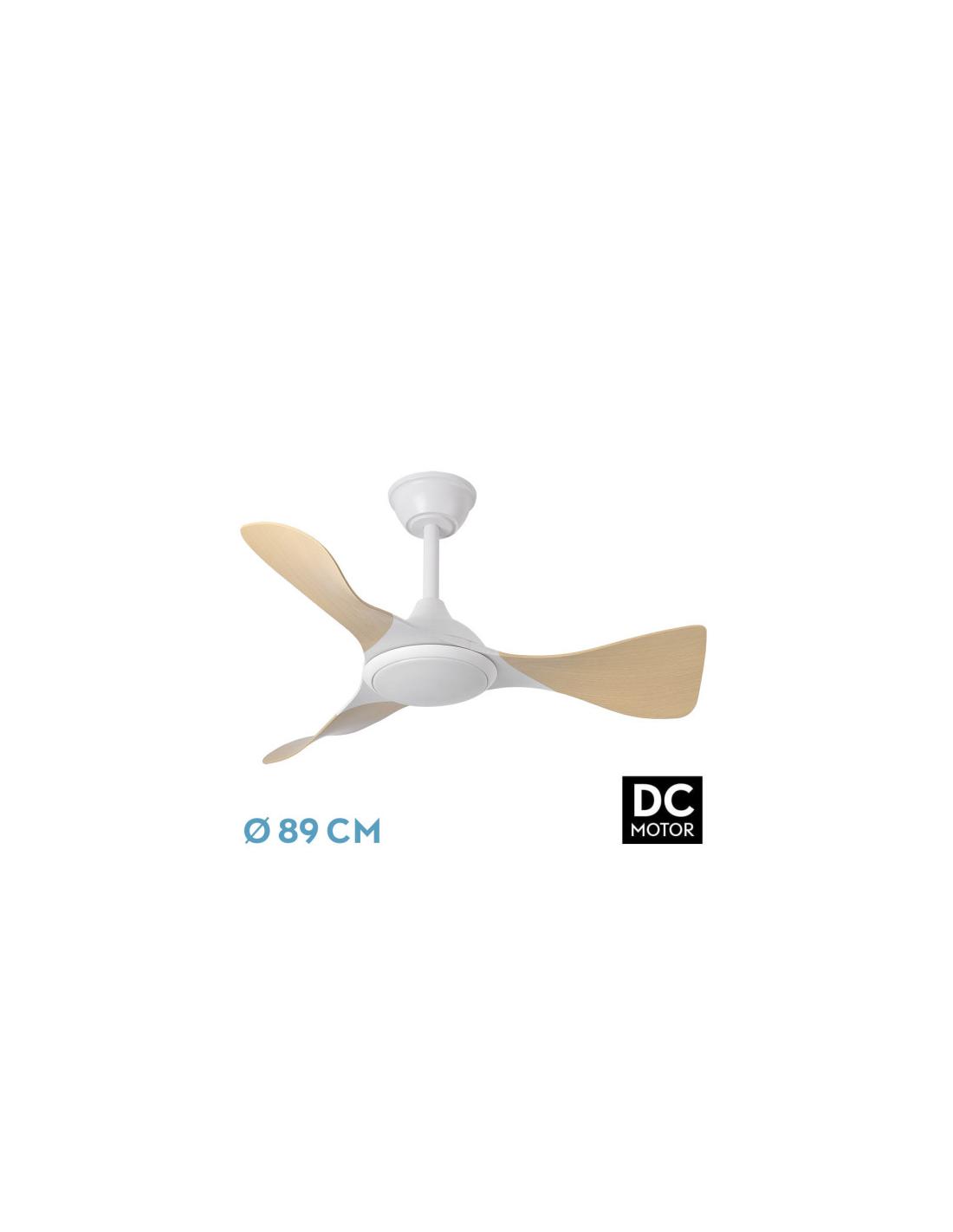 Ventilador DC de la serie CAIMAN realizado en metal, ABS y policarbonato, en color BLANCO con tres aspas de color HAYA. Tiene seis velocidades ajustables. Motor DC, con INSTALACION DE LUZ OPCIONAL. Tecnología LED incorporada con una potencia de 36 vatios, con 3 TEMPERATURAS DE LUZ( 3000-4500-6500K) y 3600 lúmenes. De diseño moderno y original. Su medida es de 26/41X89X89 centímetros, con dos tijas de 10 y 25 centímetros para instalar a distintas alturas. Control de aire verano e invierno. REGULABLE EN INTENSIDAD, con mando a distancia INCLUIDO, MEMORIA DE COLOR incorporada y TEMPORIZADOR 1/4/8 H. Su voltaje va de 186 a 265 vatios, lo que resiste en un campo muy amplio a subidas y bajadas de tensión sin sufrir daño alguno. Modelo disponible en negro, blanco, blanco/haya y en negro/roble.