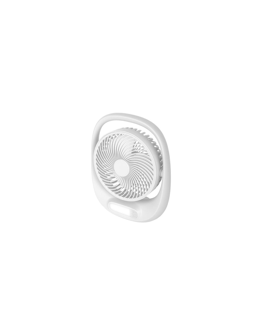 Ventilador Inalámbrico de sobremesa de la serie AGUILA realizado en ABS y policarbonato de color BLANCO con tres aspas y tres velocidades. Dispone de una ventana de luz led en su estructura ( NIGHT LIGHT), de encendido independiente, con dos intensidades de luz blanca para utilizar como punto de referencia por las noches, luz ambiente o quita miedos. Motor DC. Cabezal orientable en el plano vertical hasta 180º, pudiendo redirigir el aire a la zona que desee manualmente. Funciona también SIN CABLE, es recargable mediante alimentación por USB. Ligero y fácil de transportar, pudiéndose utilizar sobre una encimera o escritorio. Tiene una potencia máxima de 5 vatios y una medida de 30x25x8 centímetros.