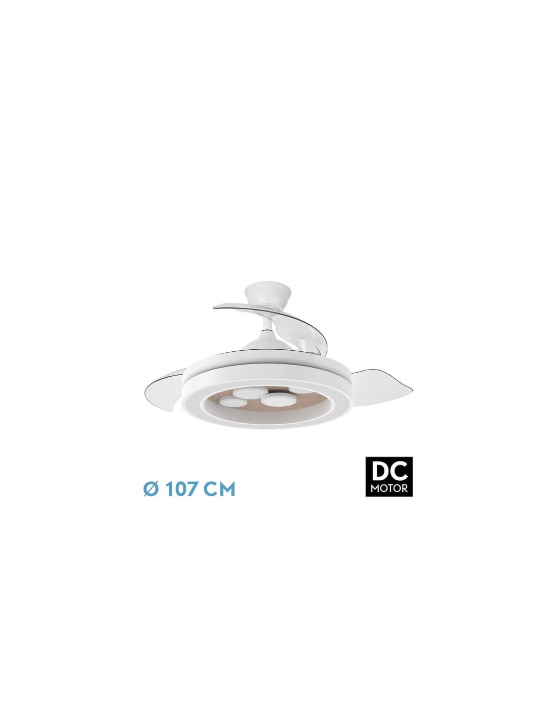 Ventilador DC de la serie CUPIDO realizado en metal, policarbonato y ABS, en color BLANCO/HAYA con tres aspas DESPLEGABLES de ABS transparente muy resistentes. Diseño muy moderno y original, con bonito juego de luces. Tiene seis velocidades ajustables. Tecnología LED integrada con una potencia de 55W, con 3 TEMPERATURAS SELECCIONABLES DE LUZ (3000-4500-6500K) y 4960 lúmenes. Control de aire verano o invierno. Su medida es de 32/47X50 centímetros con las aspas plegadas y de 32/47X107 centímetros con las aspas desplegadas. Incluye dos tijas de 10 y 25 centímetros, para colocar a distintas alturas. Mando a distancia INCLUIDO, REGULABLE EN INTENSIDAD, con MEMORIA DE COLOR incorporada y TEMPORIZADOR 2 H. Puede utilizar el control VIA APP : FAN LAMP PRO, desde el que podrá manejar también su ventilador de manera fácil e intuitiva desde su móvil. Modelo disponible en color blanco/haya y negro/madera.