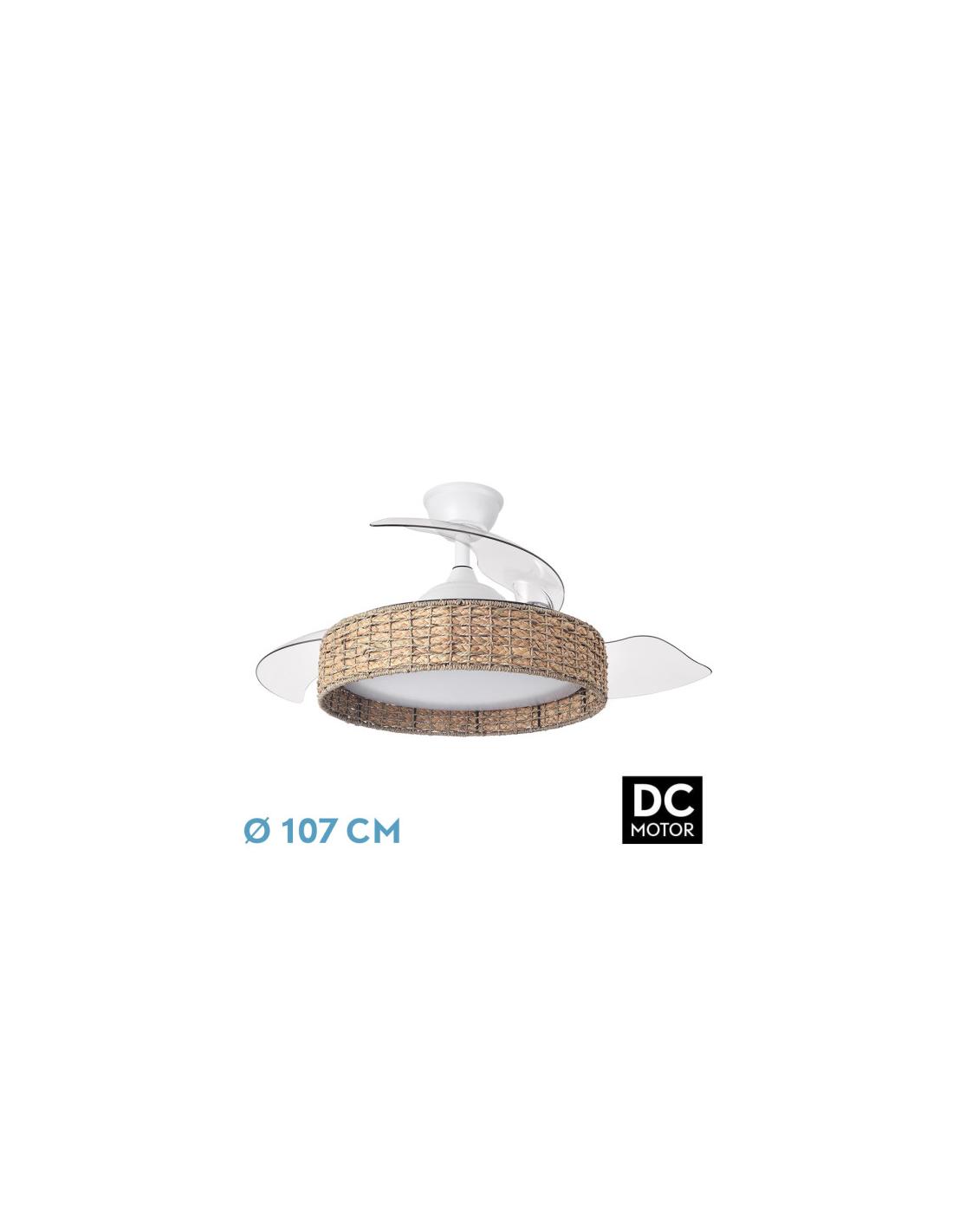 Ventilador DC de la serie CANARIO realizado en metal, rattán, policarbonato y ABS, en color BLANCO/NATURAL con tres aspas DESPLEGABLES de ABS transparente muy resistentes. Diseño muy moderno y original, rodeando a su difusor presenta una pantalla de RATTAN trenzado, de líneas sencillas y muy decorativo, acorde para combinar con múltiples estilos de decoración transmitiendo calidez y relajación en estancias de trabajo y hogares, ideal para estancias inspiradas en las zonas mediterráneas avocadas al descanso y la meditación a la misma vez que ilumina y ventila. Tiene seis velocidades ajustables. Tecnología LED integrada con una potencia de 59W, con 3 TEMPERATURAS SELECCIONABLES DE LUZ (3000-4500-6500K) y 6980 lúmenes. Control de aire verano o invierno. Su medida es de 32/47X50 centímetros con las aspas plegadas y de 32/47X107 centímetros con las aspas desplegadas. Incluye dos tijas de 10 y 25 centímetros, para colocar a distintas alturas. Mando a distancia INCLUIDO, REGULABLE EN INTENSIDAD, con MEMORIA DE COLOR incorporada y TEMPORIZADOR 2 H. Puede utilizar el control VIA APP : FAN LAMP PRO, desde el que podrá manejar también su ventilador de manera fácil e intuitiva desde su móvil.