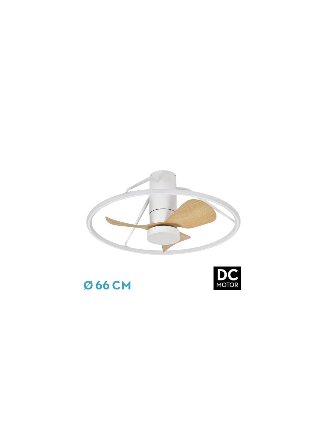 Ventilador DC de la serie OPORTO MINI realizado en ABS, silicona y metal, en color BLANCO con tres aspas en color HAYA. Tiene seis velocidades ajustables con motor DC. Tecnología LED incorporada con una potencia de 46W, 4600 lúmenes y 3 TEMPERATURAS SELECCIONABLES DE LUZ( 3000-4000-6000K) luz cálida, natural y blanco frío. Ventilador de diseño muy moderno y futurista, su cuerpo principal se encuentra rodeado por un aro de luz combinando muy bien con estilos de decoración tanto con estilos modernos como étnicos y naturales. Tiene unas dimensiones de 31,5x66x66 centímetros. Control de aire verano o invierno. Mando a distancia INCLUIDO con REGULADOR DE INTENSIDAD DE LA LUZ en tres posiciones y TEMPORIZADOR que permite programar para que el ventilador se apague automáticamente desde 1 hora hasta las 4 horas, lo que conlleva un gran ahorro de energía. Puede utilizar el control VIA APP : FAN LAMP PRO, desde el que podrá manejar también su ventilador de manera fácil e intuitiva desde su móvil. Modelo disponible en negro/marrón y en blanco/haya y en dos tamaños diferentes.