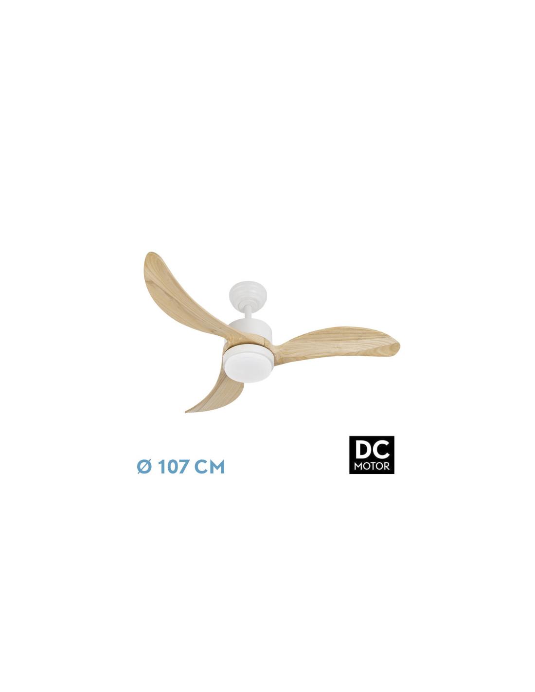 Ventilador DC de la serie BEMBEZAR de color BLANCO con 3 aspas en color HAYA. Realizado en metal, madera y policarbonato. Tiene una medida de 35,3/47,8x107x107 centímetros. Motor DC. Tecnología LED integrada con una potencia de 24W, 2424 lúmenes y COLOR DE LUZ SELECCIONABLE EN 3 TEMPERATURAS (3000-4000-6500K) luz cálida, natural y blanco frío. Dispone de control remoto con 6 velocidades diferentes, memoria de color, modo de verano/invierno, temporizador de 2/4/8 horas y Regulador de Intensidad. Incluye dos tijas de 12,5 y 25 centímetros para instalar en techos a distintas alturas. Modelo disponible en color blanco/haya y en negro/roble.