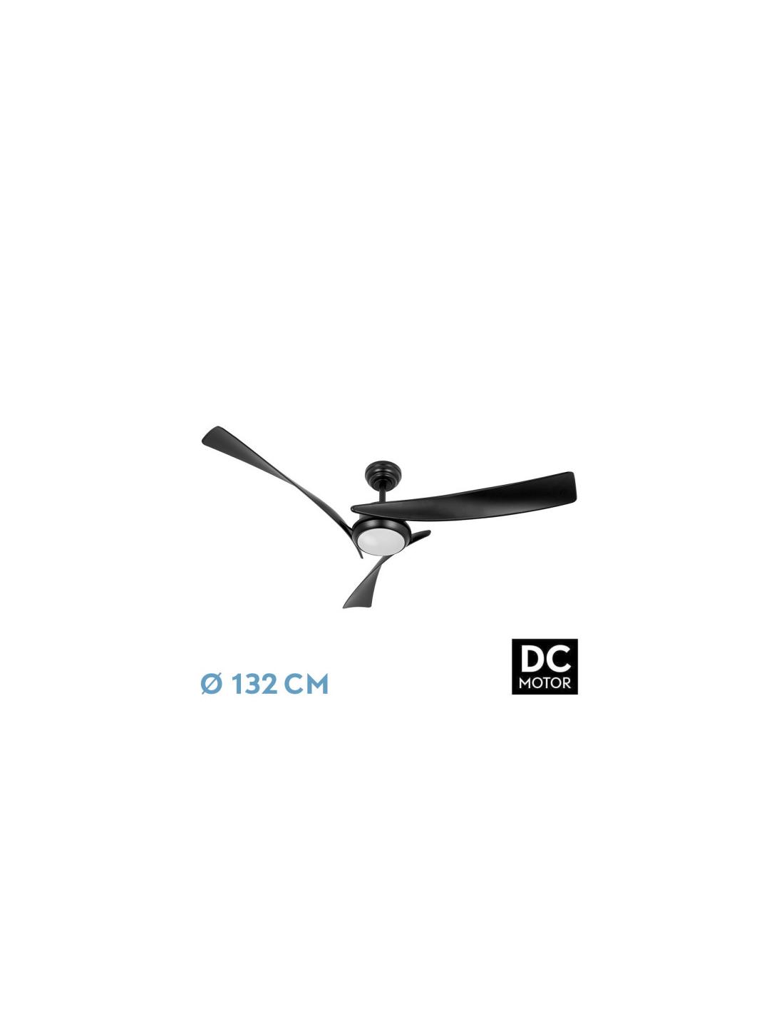 Ventilador DC de la serie TARENTO de color NEGRO con 3 aspas. Realizado en metal, ABS y policarbonato. Tiene una medida de 34/46,5x132x132 centímetros. Motor DC. De diseño moderno y original. Tecnología LED integrada con una potencia de 24W, 2424 lúmenes y COLOR DE LUZ SELECCIONABLE EN 3 TEMPERATURAS (3000-4000-6500K) luz cálida, natural y blanco frío. Dispone de control remoto con 6 velocidades diferentes, memoria de color, modo de verano/invierno, temporizador de 2/4/8 horas y Regulador de Intensidad. Incluye dos tijas de 12,5 y 25 centímetros para instalar en techos a distintas alturas. Modelo disponible en color blanco y en negro.