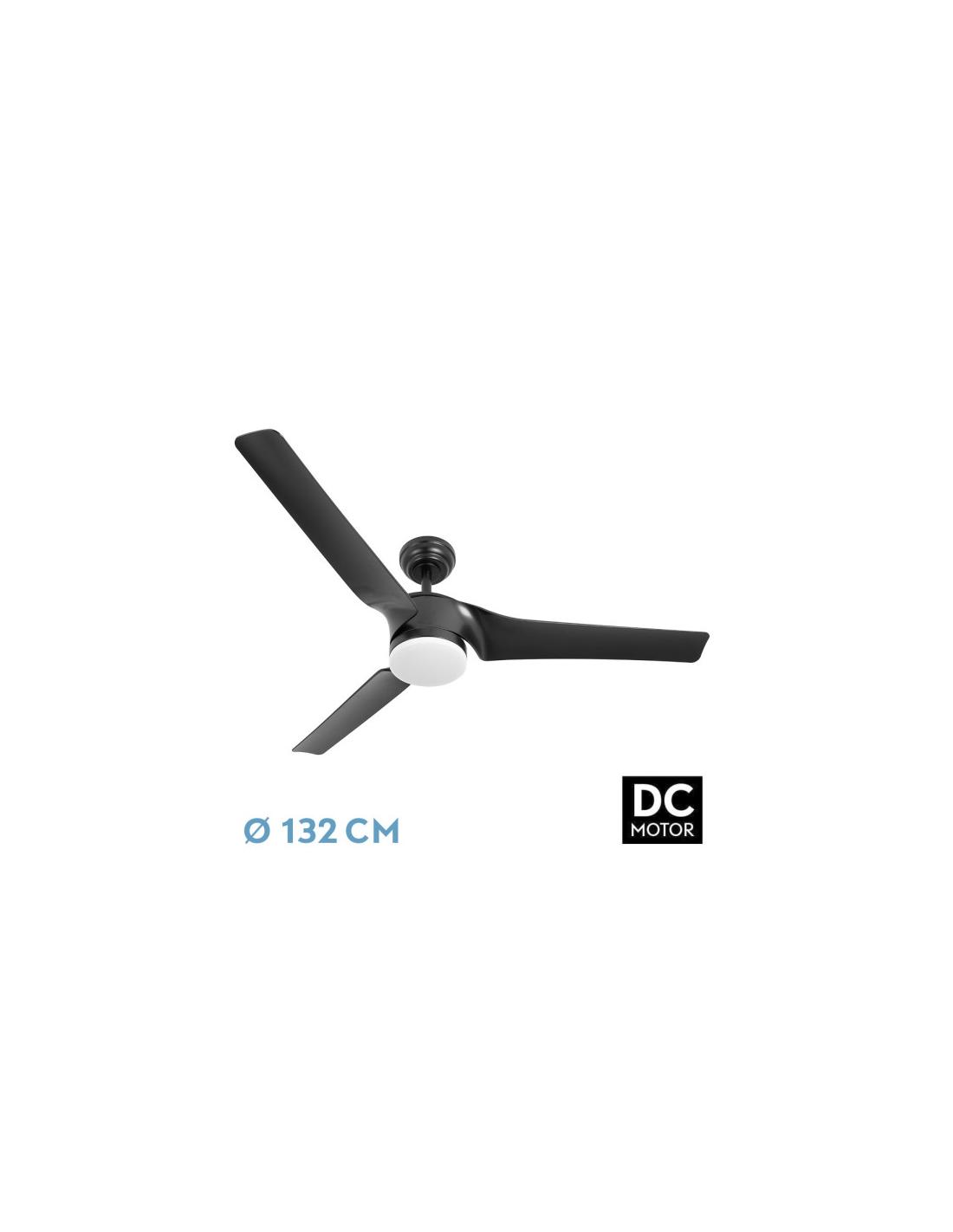 Ventilador DC de la serie MONTIJO de color NEGRO con 3 aspas. Realizado en metal, ABS y policarbonato. Tiene una medida de 35/47,5x132x132 centímetros. Motor DC. Tecnología LED integrada con una potencia de 24W, 2424 lúmenes y COLOR DE LUZ SELECCIONABLE EN 3 TEMPERATURAS (3000-4000-6500K) luz cálida, natural y blanco frío. Dispone de control remoto con 6 velocidades diferentes, memoria de color, modo de verano/invierno, temporizador de 2/4/8 horas y Regulador de Intensidad. Incluye dos tijas de 12,5 y 25 centímetros para instalar en techos a distintas alturas. Modelo disponible en color blanco, y en negro.