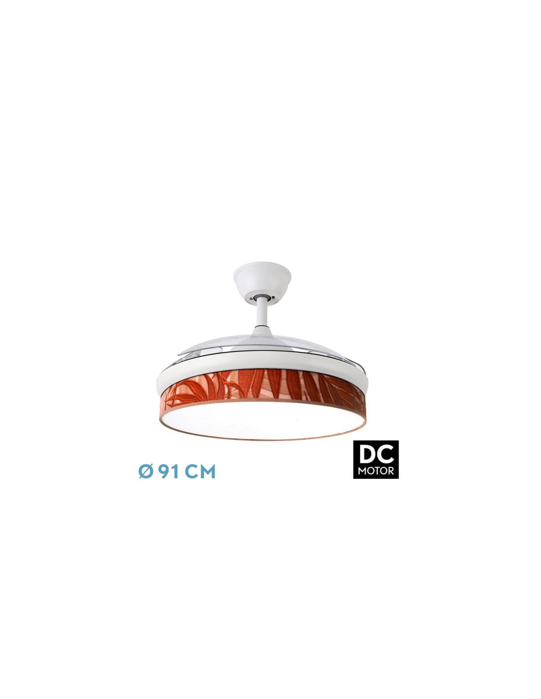 Exclusivo y original ventilador DC de la serie MODA con tres aspas DESPLEGABLES de ABS, en color BLANCO con difusor HOJA CALDERA. Realizado en metal, ABS, textil y policarbonato. De estilo moderno y versátil, los diseños y colores de sus difusores hacen que este ventilador tanto en funcionamiento como en sólo modo lámpara, se haga el centro de atención de la habitación que ilumina. Ideal tanto para ambientes modernos como clásicos, muy acorde con los nuevos estilos de decoración combinando colores y texturas. Motor DC con seis velocidades ajustables. Tecnología LED integrada con una potencia de 72W, 7200 lúmenes y con 3 TEMPERATURAS SELECCIONABLES DE LUZ (3000-4000-6000K). Control de aire verano o invierno. Su medida es de 37/52X40X40 centímetros con las aspas plegadas y de 37/52X91X91 centímetros con las aspas desplegadas, con dos medidas de tija para instalarlo a diferentes alturas. Mando a distancia INCLUIDO con MEMORIA DE COLOR incorporada y TEMPORIZADOR 1/2/4 horas. Modelo disponible tanto en negro como en blanco, con una gran variedad de diseños y colores en sus difusores y en dos tamaños a elegir.