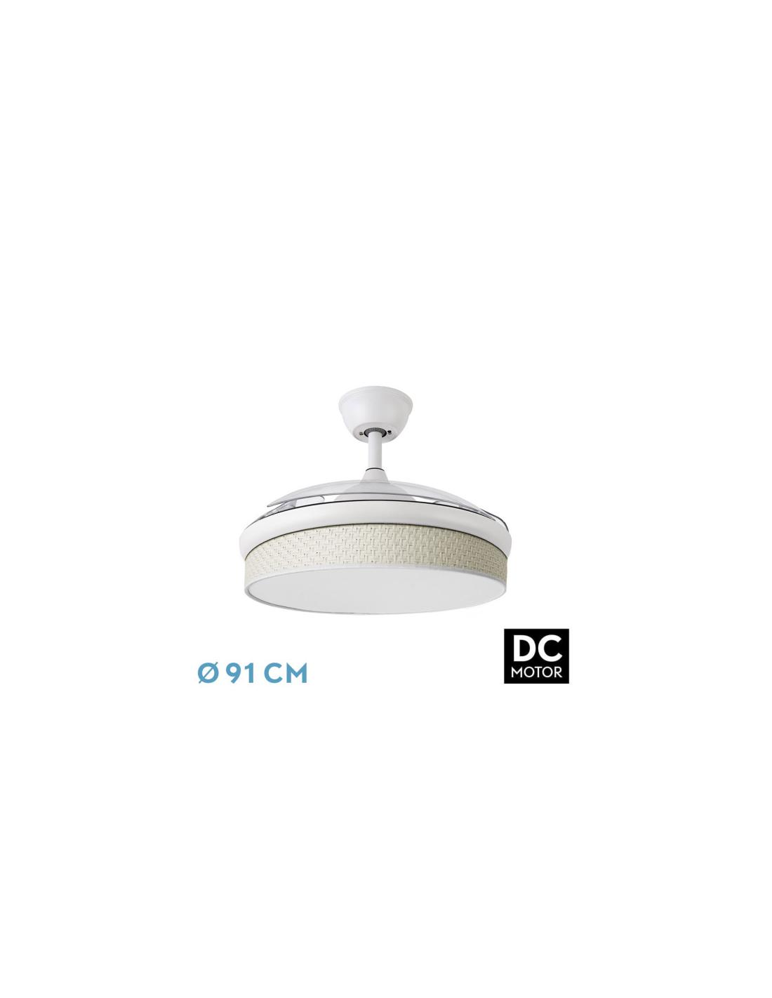 Exclusivo y original ventilador DC de la serie MODA con tres aspas DESPLEGABLES de ABS, en color BLANCO con difusor CAÑIZO BLANCO. Realizado en metal, ABS, textil y policarbonato. De estilo moderno y versátil, los diseños y colores de sus difusores hacen que este ventilador tanto en funcionamiento como en sólo modo lámpara, se haga el centro de atención de la habitación que ilumina. Ideal tanto para ambientes modernos como clásicos, muy acorde con los nuevos estilos de decoración combinando colores y texturas. Motor DC con seis velocidades ajustables. Tecnología LED integrada con una potencia de 72W, 7200 lúmenes y con 3 TEMPERATURAS SELECCIONABLES DE LUZ (3000-4000-6000K). Control de aire verano o invierno. Su medida es de 37/52X40X40 centímetros con las aspas plegadas y de 37/52X91X91 centímetros con las aspas desplegadas, con dos medidas de tija para instalarlo a diferentes alturas. Mando a distancia INCLUIDO con MEMORIA DE COLOR incorporada y TEMPORIZADOR 1/2/4 horas. Modelo disponible tanto en negro como en blanco, con una gran variedad de diseños y colores en sus difusores y en dos tamaños a elegir.