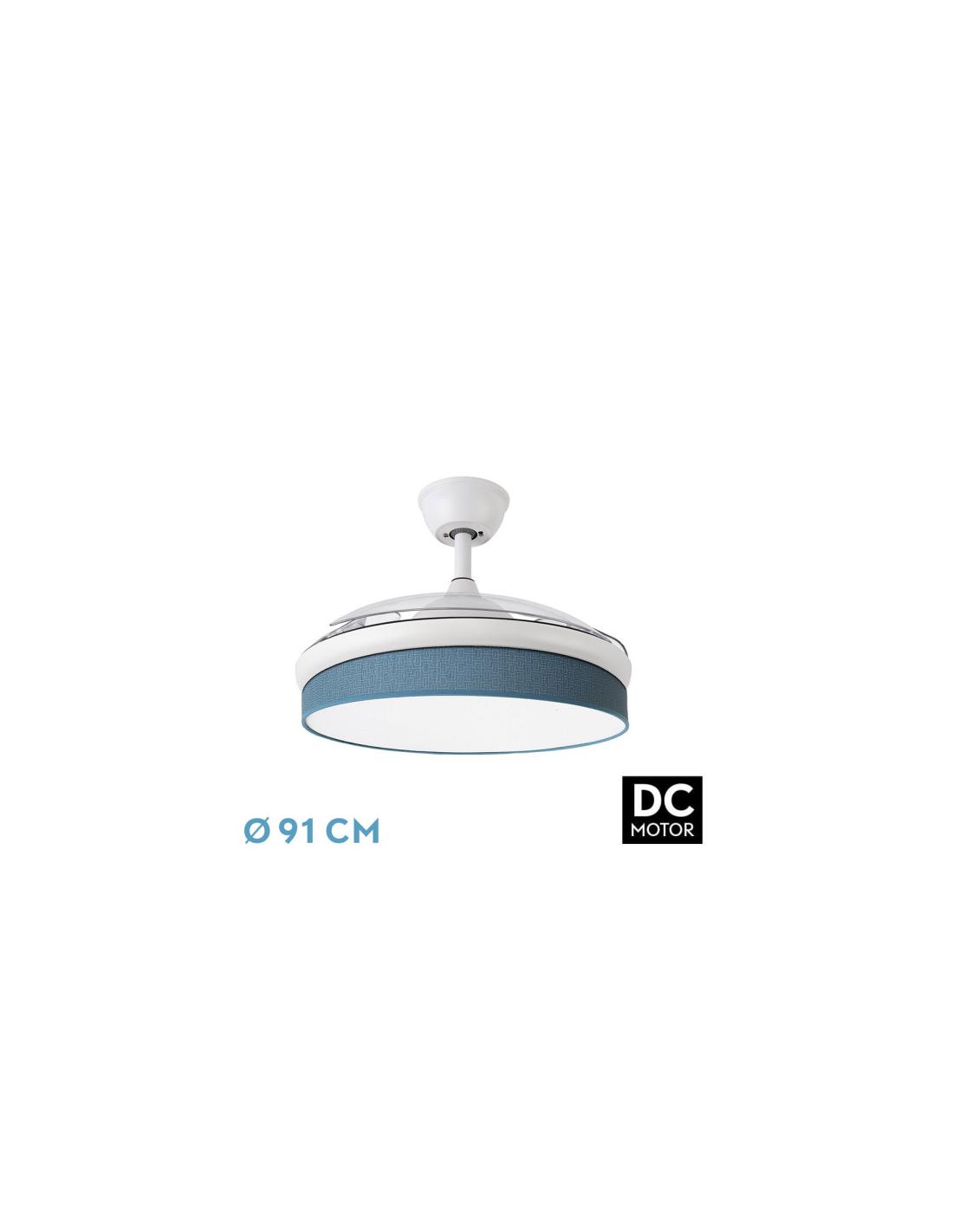 Exclusivo y original ventilador DC de la serie MODA con tres aspas DESPLEGABLES de ABS, en color BLANCO con difusor AZUL. Realizado en metal, ABS, textil y policarbonato. Diseño muy moderno y versátil, los diseños y colores de sus difusores hacen que este ventilador tanto en funcionamiento como en sólo modo lámpara, se haga el centro de atención de la habitación que decora. Ideal tanto para ambientes modernos como clásicos, muy acorde con los nuevos estilos de decoración combinando colores y texturas. Motor DC con seis velocidades ajustables. Tecnología LED integrada con una potencia de 72W, 7200 lúmenes y con 3 TEMPERATURAS SELECCIONABLES DE LUZ (3000-4000-6000K). Control de aire verano o invierno. Su medida es de 37/52X40X40 centímetros con las aspas plegadas y de 37/52X91X91 centímetros con las aspas desplegadas, con dos medidas de tija para instalarlo a diferentes alturas. Mando a distancia INCLUIDO con MEMORIA DE COLOR incorporada y TEMPORIZADOR 1/2/4 H. Modelo disponible tanto en negro como en blanco, con una gran variedad de diseños y colores en sus difusores y en dos tamaños a elegir.