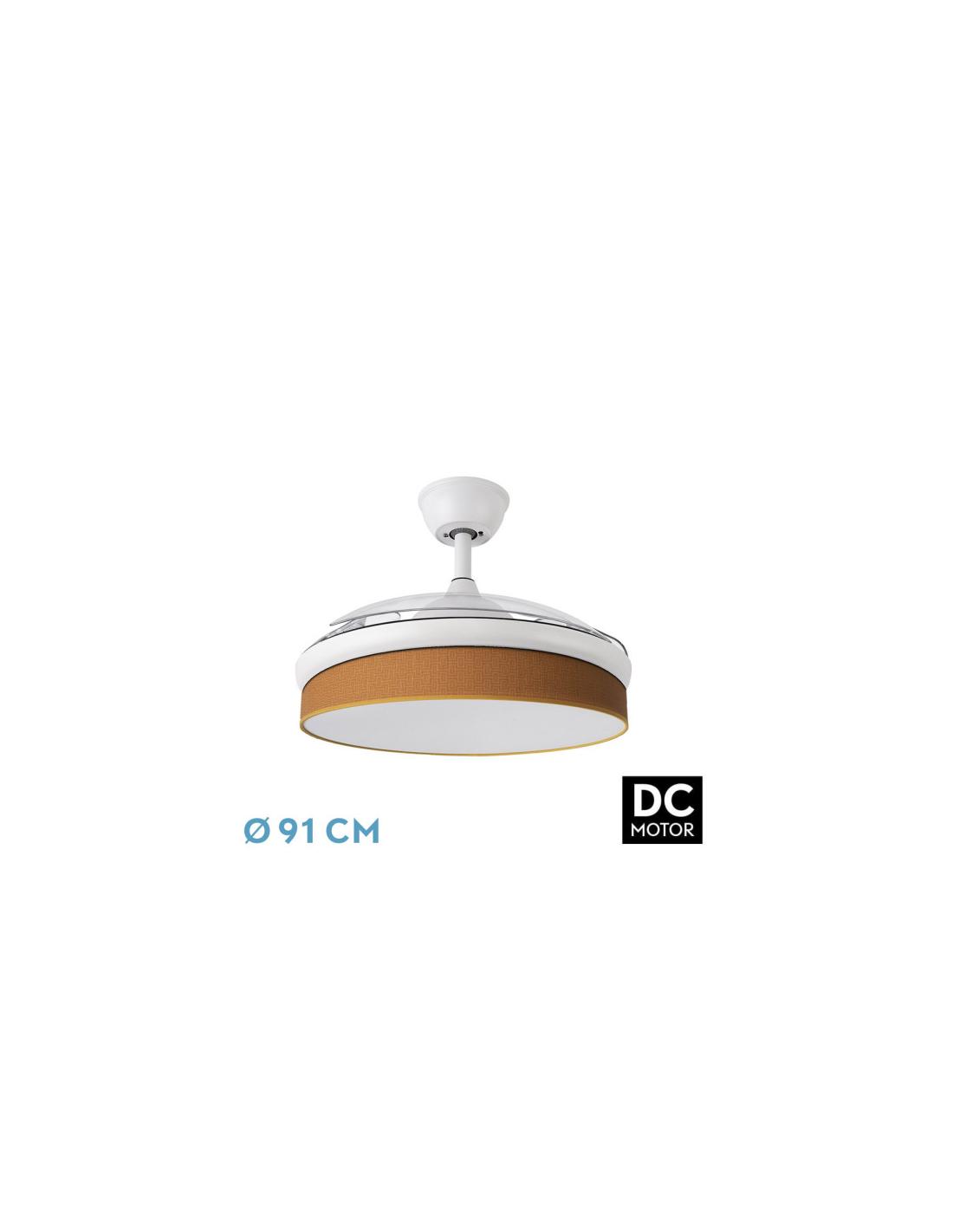 Exclusivo y original ventilador DC de la serie MODA con tres aspas DESPLEGABLES de ABS, en color BLANCO con difusor NARANJA. Realizado en metal, ABS, textil y policarbonato. Diseño muy moderno y versátil, los diseños y colores de sus difusores hacen que este ventilador tanto en funcionamiento como en sólo modo lámpara, se haga el centro de atención de la habitación que decora. Ideal tanto para ambientes modernos como clásicos, muy acorde con los nuevos estilos de decoración combinando colores y texturas. Motor DC con seis velocidades ajustables. Tecnología LED integrada con una potencia de 72W, 7200 lúmenes y con 3 TEMPERATURAS SELECCIONABLES DE LUZ (3000-4000-6000K). Control de aire verano o invierno. Su medida es de 37/52X40X40 centímetros con las aspas plegadas y de 37/52X91X91 centímetros con las aspas desplegadas, con dos medidas de tija para instalarlo a diferentes alturas. Mando a distancia INCLUIDO con MEMORIA DE COLOR incorporada y TEMPORIZADOR 1/2/4 H. Modelo disponible tanto en negro como en blanco, con una gran variedad de diseños y colores en sus difusores y en dos tamaños a elegir.