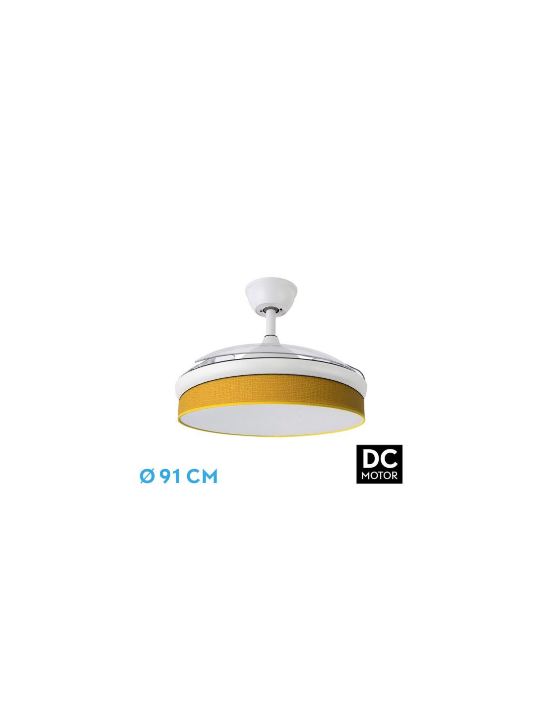 Exclusivo y original ventilador DC de la serie MODA con tres aspas DESPLEGABLES de ABS, en color BLANCO con difusor AMARILLO. Realizado en metal, ABS, textil y policarbonato. Diseño muy moderno y versátil, las decoraciones y colores de sus difusores hacen que este ventilador tanto en funcionamiento como en sólo modo lámpara, se haga el centro de la habitación que decore. Motor DC con seis velocidades ajustables. Tecnología LED integrada con una potencia de 72W, 7200 lúmenes y con 3 TEMPERATURAS SELECCIONABLES DE LUZ (3000-4000-6000K). Control de aire verano o invierno. Su medida es de 37/52X40X40 centímetros con las aspas plegadas y de 37/52X91X91 centímetros con las aspas desplegadas, con dos medidas de tija para instalarlo a diferentes alturas. Mando a distancia INCLUIDO con MEMORIA DE COLOR incorporada y TEMPORIZADOR 1/2/4 H. Modelo disponible tanto en negro como en blanco, con una gran variedad de diseños en sus difusores y en dos tamaños a elegir.<br/><br/></div>