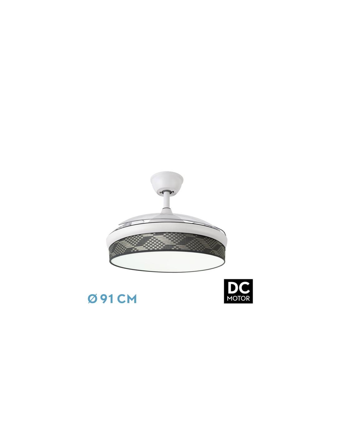 Exclusivo y original ventilador DC de la serie MODA con tres aspas DESPLEGABLES de ABS, en color BLANCO con difusor TETRIS GRIS. Realizado en metal, ABS, textil y policarbonato. Diseño muy moderno y versátil, las decoraciones y colores de sus difusores hacen que este ventilador tanto en funcionamiento como en sólo modo lámpara, se haga el centro de la habitación que decore. Motor DC con seis velocidades ajustables. Tecnología LED integrada con una potencia de 72W, 7200 lúmenes y con 3 TEMPERATURAS SELECCIONABLES DE LUZ (3000-4000-6000K). Control de aire verano o invierno. Su medida es de 37/52X40X40 centímetros con las aspas plegadas y de 37/52X91X91 centímetros con las aspas desplegadas, con dos medidas de tija para instalarlo a diferentes alturas. Mando a distancia INCLUIDO con MEMORIA DE COLOR incorporada y TEMPORIZADOR 1/2/4 H. Modelo disponible tanto en negro como en blanco, con una gran variedad de diseños en sus difusores y en dos tamaños para elegir.