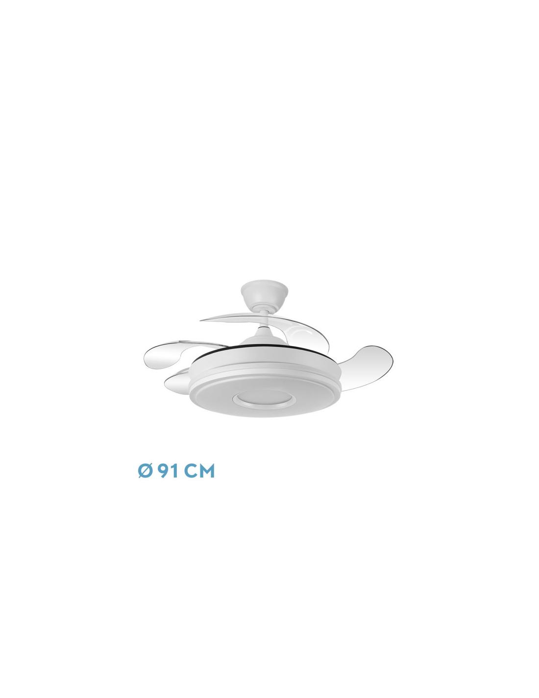 Ventilador DC serie DANI MINI realizado en metal, ABS y policarbonato, en color BLANCO con cuatro aspas DESPLEGABLES en ABS muy resistentes. Tiene seis velocidades ajustables. Motor DC. Tecnología LED integrada con una potencia de 59W, con 3 TEMPERATURAS SELECCIONABLES DE LUZ (3000-4000-6000K), luz cálida, natural y blanco frío, y 6980 lúmenes. Control de aire verano o invierno. Su medida es de 34,5/42X40 centímetros con las aspas plegadas y de 34,5/42X91 centímetros con las aspas desplegadas. Incluye dos tijas de 12,5 y 20 centímetros. Es REGULABLE EN INTENSIDAD con mando a distancia INCLUIDO, MEMORIA DE COLOR incorporada y TEMPORIZADOR 2/4 H. Modelo disponible en color blanco, níquel, negro, marrón y cuero, y también en dos tamaños.