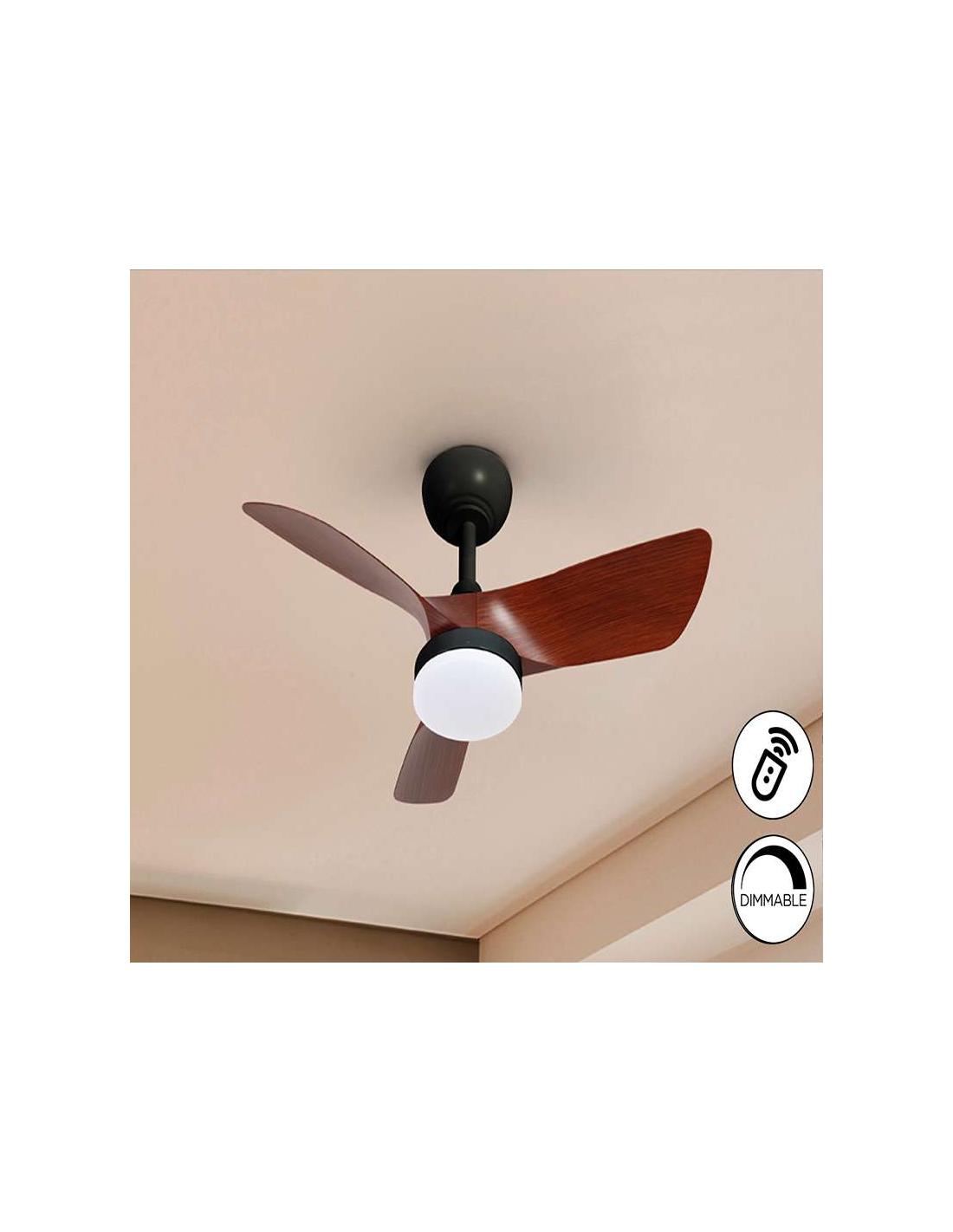 Ventilador de techo con luz LED DIMABLE y CCT (temperatura de luz regulable). Realizado en metal acabado negro mate y aspas en acrílico acabado madera de nogal. Difusor acrílico opal. Motor DC, 6 velocidades e inversión. Temporizador, función brisa