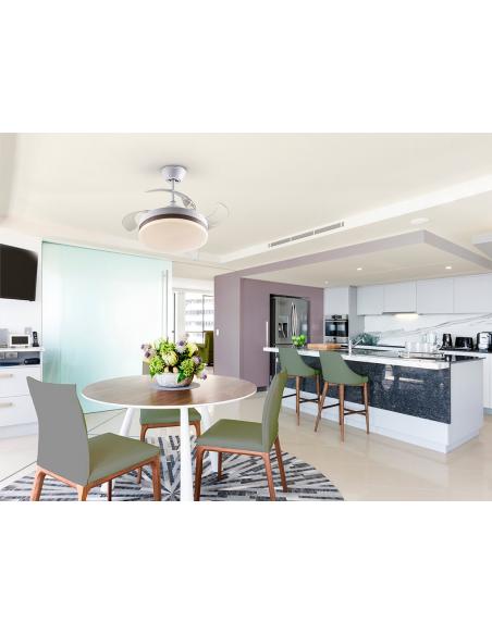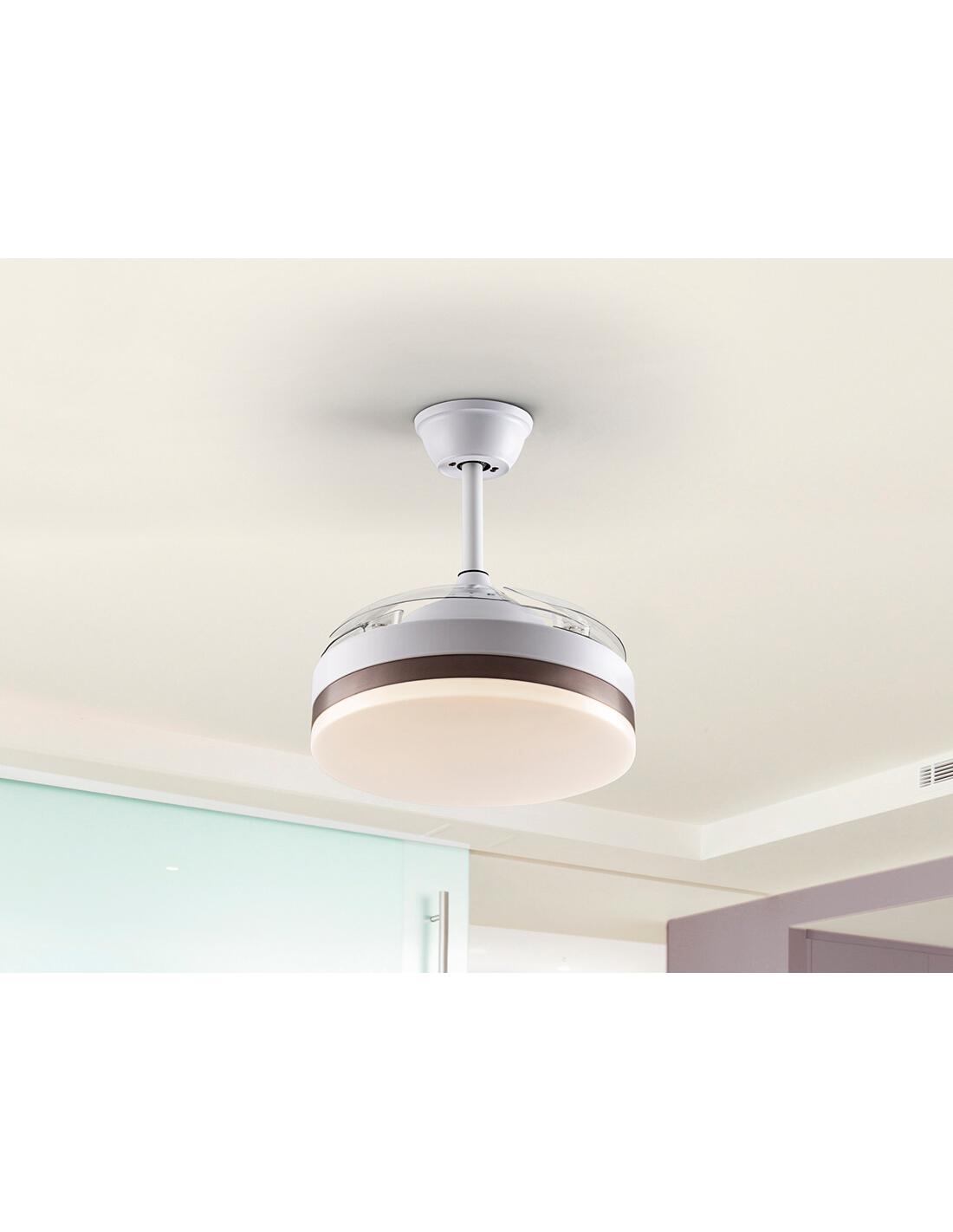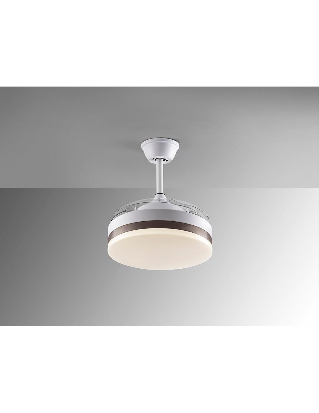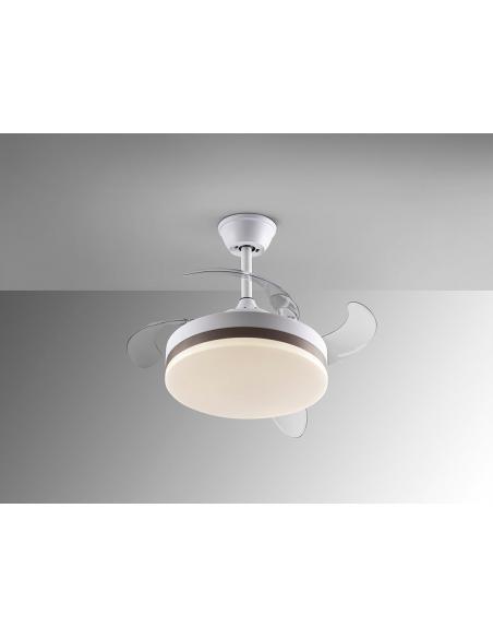 Ventilador de techo con luz LED DIMMABLE CCT en metal acabado blanco mate y aro en bronce. Difusor opal y aspas escamoteables transparentes, en acrílico. Motor DC de 6 velocidades e inversión. Temperatura de color regulable.Temporizador. Función memo Incluye mando a distancia. 24W LED, 1.300 lm, 3.000-4000-6.000 K. Ventilador: Hélice de 4 aspas. Motor DC 35W. 6 Velocidades. Movimiento reversible. Función brisa. Rumor: 37a 42Db.