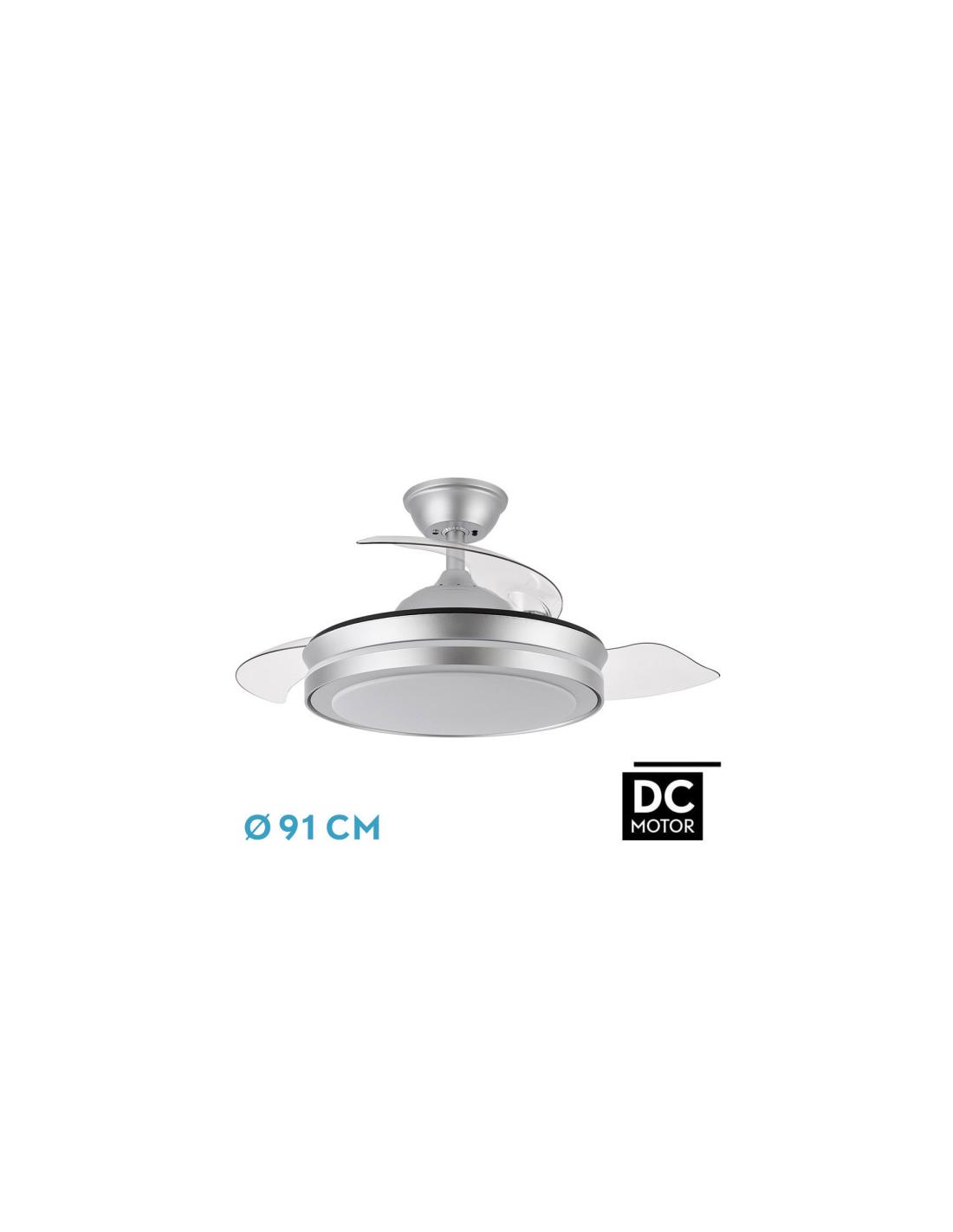 Ventilador DC de la serie ESPARTA MINI realizado en metal, policarbonato y ABS, en color PLATA con tres aspas DESPLEGABLES de ABS transparente muy resistentes. Tiene seis velocidades ajustables. Tecnología LED integrada con una potencia de 72W, con 3 TEMPERATURAS SELECCIONABLES DE LUZ (3000-4000-6000K) y 6120 lúmenes. Control de aire verano o invierno. Su medida es de 32/47X40 centímetros con las aspas plegadas y de 32/47X91 centímetros con las aspas desplegadas. Incluye dos tijas de 10 y 25 centímetros, para colocar a distintas alturas. Mando a distancia INCLUIDO con MEMORIA DE COLOR incorporada y TEMPORIZADOR 1/4 H. Modelo disponible con un diámetro de 132, 107, 91 Y 72 centímetros y todos en blanco, negro o plata.