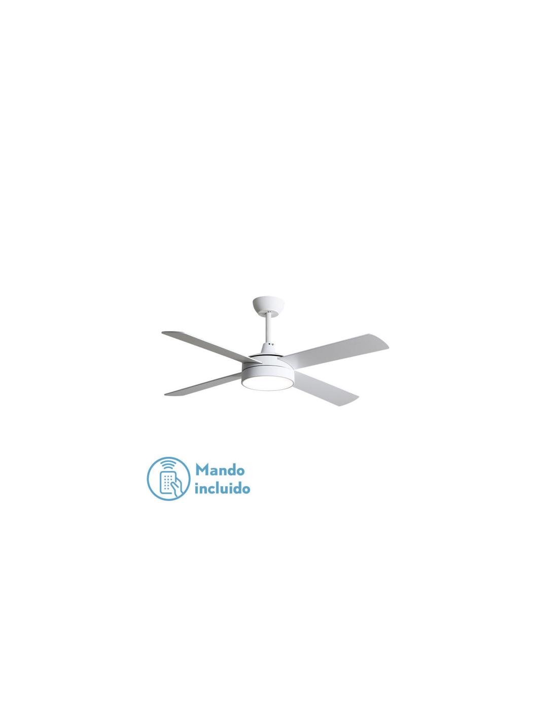 Ventilador DC de la serie NEVERY realizado en metal, MDF y policarbonato, en color BLANCO con CUATRO aspas REVERSIBLES de color HAYA/BLANCO. Tiene motor DC con seis velocidades ajustables. Tecnología LED incorporada con una potencia de 26W, 2950 lúmenes y 3 TEMPERATURAS SELECCIONABLES DE LUZ ( 3000-4000-6000K) luz cálida, natural y blanco frío. Su medida es de 28/43x122x122 centímetros, viene con dos medidas de Tija lo que permite adaptarlo para distintas alturas de techo. Control de aire verano o invierno. Mando a distancia INCLUIDO con MEMORIA DE COLOR incorporada y TEMPORIZADOR 1/2/4 H. Modelo disponible en Blanco-Blanco/Haya, Cuero-Roble/Nogal, Negro-Negro/Roble y Níquel-Haya/Plata.