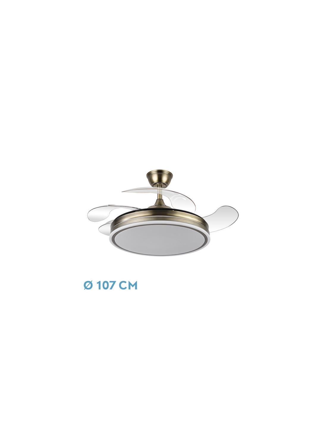 Ventilador BAYOMO realizado en metal y policarbonato, en color CUERO con cuatro aspas DESPLEGABLES de ABS transparente muy resistentes. Motor DC. Tiene seis velocidades ajustables. Tecnología LED integrada con una potencia de 59W, con 3 TEMPERATURAS DE LUZ (3000-4000-6000K) y 6980 lúmenes. Control de aire verano o invierno. Su medida es de 34,5/42X50X50 centímetros con las aspas plegadas y de 34,5/42X107X107 centímetros con las aspas desplegadas, con dos medidas de tija para instalarlo a diferentes alturas. Mando a distancia INCLUIDO, REGULABLE EN INTENSIDAD, con MEMORIA DE COLOR incorporada y TEMPORIZADOR 2/4 H. Modelo disponible en color Níquel, Cuero, Blanco y en color Negro.