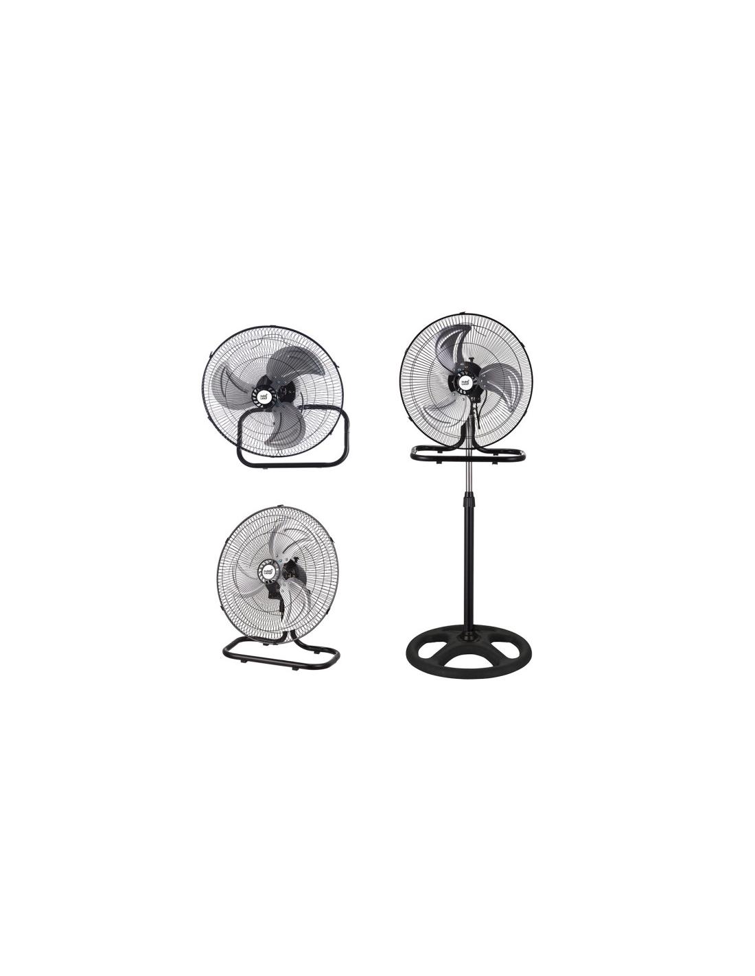 Ventilador 3 en 1 de la serie RECIO realizado en metal y policarbonato de color NEGRO con tres fuertes aspas de aluminio en color PLATA. Adaptable a ventilador tanto de suelo, de pie como de pared. Con cabezal oscilante y multi orientable y tres velocidades. Motor AC. Con dos funciones de movimiento, fijo y rotatorio. Tiene una potencia de 70 watios , una medida como ventilador de pie, regulable en altura, de 100<,130x50x50 centímetros.