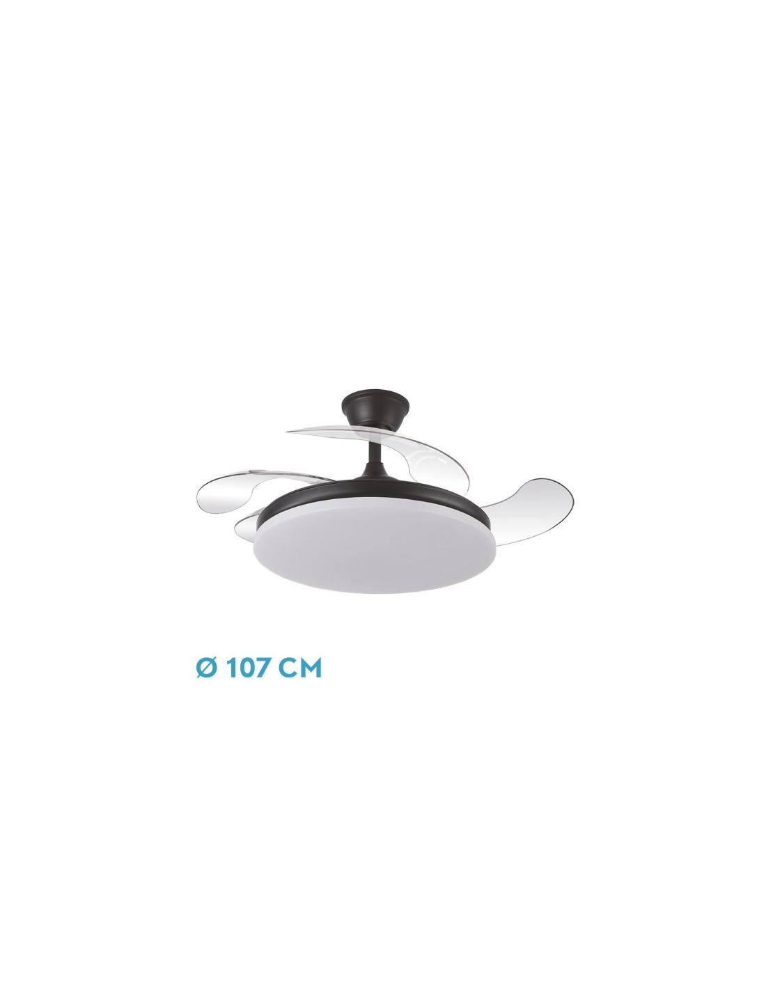 Ventilador DC de la serie TRIDENTE realizado en metal, policarbonato y ABS, en color NEGRO con cuatro aspas DESPLEGABLES de ABS transparente muy resistentes. De diseño innovador, ideal para completar tanto en decoraciones modernas como clásicas, realizando tanto la función de lámpara como de ventilador. Motor DC con seis velocidades ajustables. Tecnología LED integrada con una potencia de 59W, 6980 lúmenes y 3 TEMPERATURAS SELECCIONABLES DE LUZ (3000-4000-6000K) luz cálida, natural y blanco frío. Es REGULABLE EN INTENSIDAD, con mando a distancia INCLUIDO con MEMORIA DE COLOR incorporada y TEMPORIZADOR 2/4 H. Control de aire verano o invierno. Su medida es de 34,5/42X50 centímetros con las aspas plegadas y de 34,5/42X107 centímetros con las aspas desplegadas. Incluye dos tijas de 12,5 y 20 centímetros, para colocar a distintas alturas. Encontramos en esta serie dos tamaños de ventiladores y en los colores blanco, negro, níquel y cuero, para elegir el más le guste y el que mejor se adapte a su decoración.