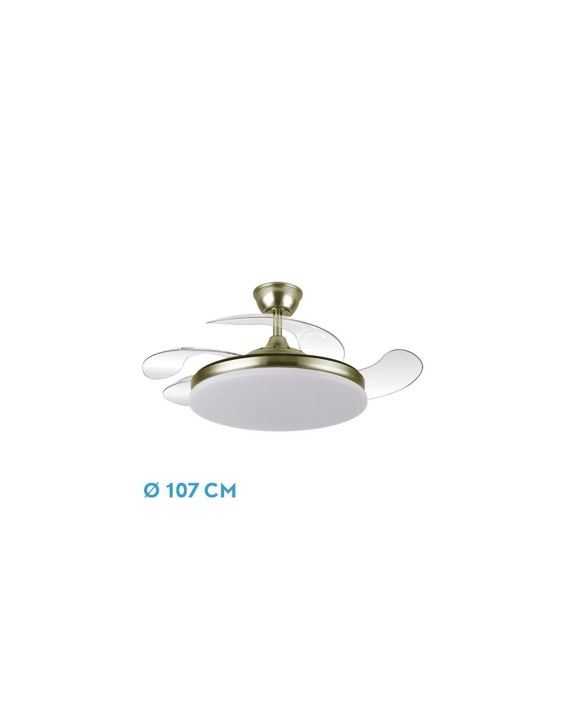 Ventilador DC de la serie TRIDENTE realizado en metal, policarbonato y ABS, en color CUERO con cuatro aspas DESPLEGABLES de ABS transparente muy resistentes. De diseño innovador, ideal para completar tanto en decoraciones modernas como clásicas, realizando tanto la función de lámpara como de ventilador. Motor DC con seis velocidades ajustables. Tecnología LED integrada con una potencia de 59W, 6980 lúmenes y 3 TEMPERATURAS SELECCIONABLES DE LUZ (3000-4000-6000K) luz cálida, natural y blanco frío. Es REGULABLE EN INTENSIDAD, con mando a distancia INCLUIDO con MEMORIA DE COLOR incorporada y TEMPORIZADOR 2/4 H. Control de aire verano o invierno. Su medida es de 34,5/42X50 centímetros con las aspas plegadas y de 34,5/42X107 centímetros con las aspas desplegadas. Incluye dos tijas de 12,5 y 20 centímetros, para colocar a distintas alturas. Encontramos en esta serie dos tamaños de ventiladores y en los colores blanco, negro, níquel y cuero, para elegir el más le guste y el que mejor se adapte a su decoración.