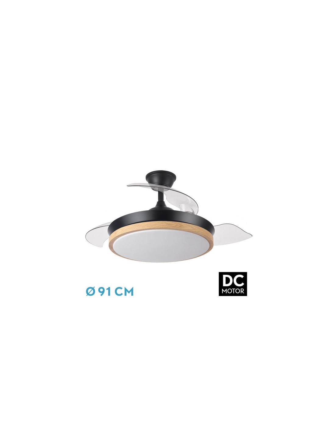 Ventilador DC de la serie EVROS realizado en metal, policarbonato y ABS, en color NEGRO/HAYA con tres aspas DESPLEGABLES de ABS transparente muy resistentes. Tiene seis velocidades ajustables. Tecnología LED integrada con una potencia de 72W, con 3 TEMPERATURAS SELECCIONABLES DE LUZ (3000-4000-6000K) y 6120 lúmenes. Control de aire verano o invierno. Su medida es de 32/47X40 centímetros con las aspas plegadas y de 32/47X91 centímetros con las aspas desplegadas. Incluye dos tijas de 10 y 25 centímetros, para colocar a distintas alturas. Mando a distancia INCLUIDO, con MEMORIA DE COLOR incorporada y TEMPORIZADOR 2/4 H. Disponibles en esta serie en blanco/haya y en negro/haya y en dos tamaños diferentes.