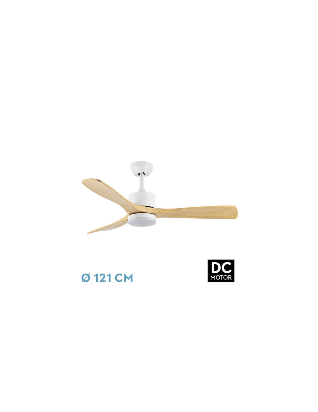 Ventilador DC AZABACHE realizado en metal, ABS y policarbonato, en color BLANCO con TRES aspas de color HAYA. Motor DC, tiene seis velocidades ajustables. Tecnología LED incorporada con una potencia de 20W, con 3 TEMPERATURAS DE LUZ( 3000-4000-6500K) y 2350 lúmenes. Su medida es de 40/50X121X121 centímetros, viene con DOS MEDIDAS DE TIJA, lo que permite adaptarlo para distintas alturas de techo. Control de aire verano o invierno. Mando a distancia INCLUIDO con MEMORIA DE COLOR incorporada y TEMPORIZADOR 1/2/4 H. Modelo también disponible en Negro-Roble.