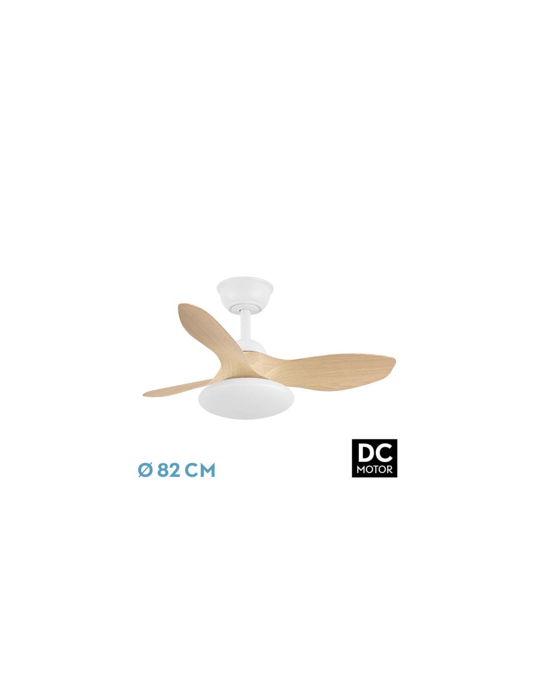 Ventilador DC de la serie PARAMO de color BLANCO/HAYA con tres aspas y seis velocidades. Sus dimensiones son de 32,5/47,5x82x82 centímetros, con dos medidas de TIJA incluidas para colocar a distintas alturas. Motor DC. Posee Tecnología LED integrado con una potencia de 36 watios, 2880 lúmenes y luz seleccionable en 3 posiciones (3000k, 4500k y 6000k) luz cálida, blanco natural y blanco frío. Tiene control remoto INCLUIDO con la opción VERANO/INVIERNO, MEMORIA DE COLOR Y TEMPORIZADOR 1/2/4 horas. Realizado en metal, policarbonato y ABS. Disponibles en esta serie de color blanco, negro y blanco-haya.